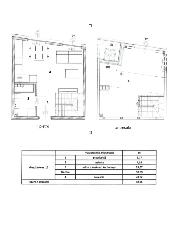 - II poziom (antresola 23,22 m2): idealne na sypialnie, gabinet lub pokój dziecięcy.