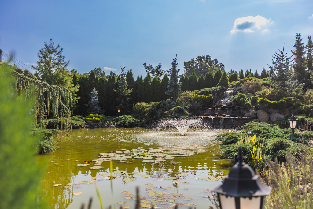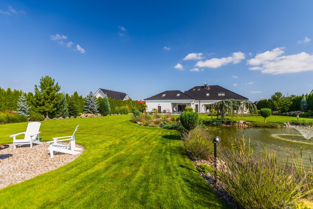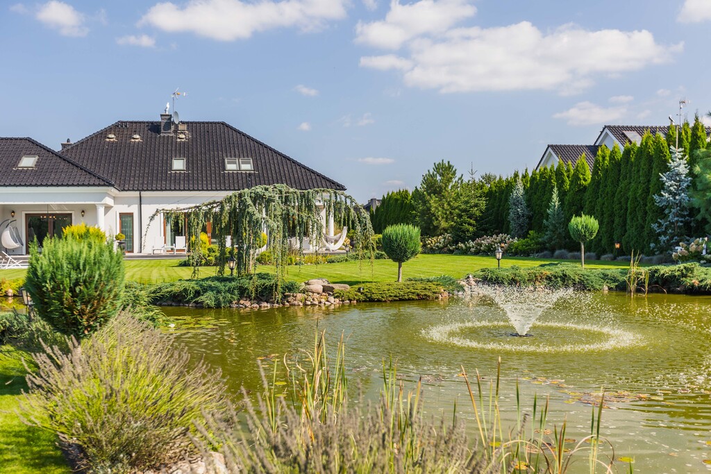 Ogród to osobna opowieść - zaprojektowany przez jedno z najlepszych biur projektowych w Polsce, przypomina małą prywatna oazę. Mamy tu oczko wodne z złotymi rybkami i białymi liliami, spektakularny wodospad z podświetleniem i imponujący staw z ponad setka karpi Koi.