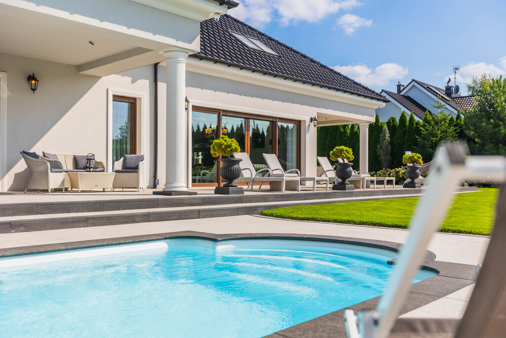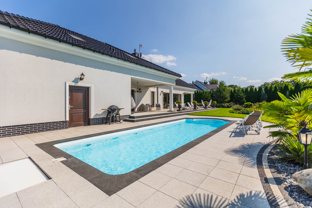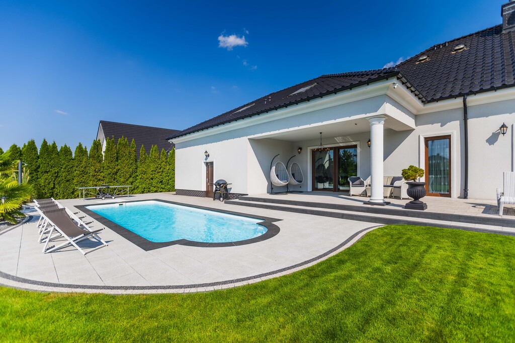 Basen kąpielowy 11x4 m z podgrzewaniem i kolorowym oświetleniem sąsiaduje z mini gajem egzotycznym, w którym rosną palmy i juki - tworząc śródziemnomorski klimat, idealny na długie letnie popołudnia.