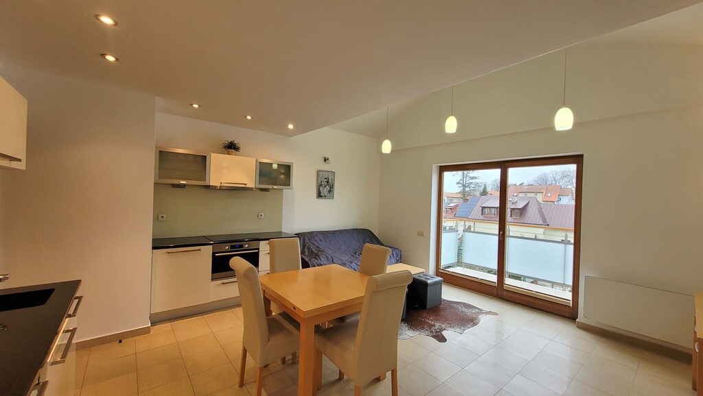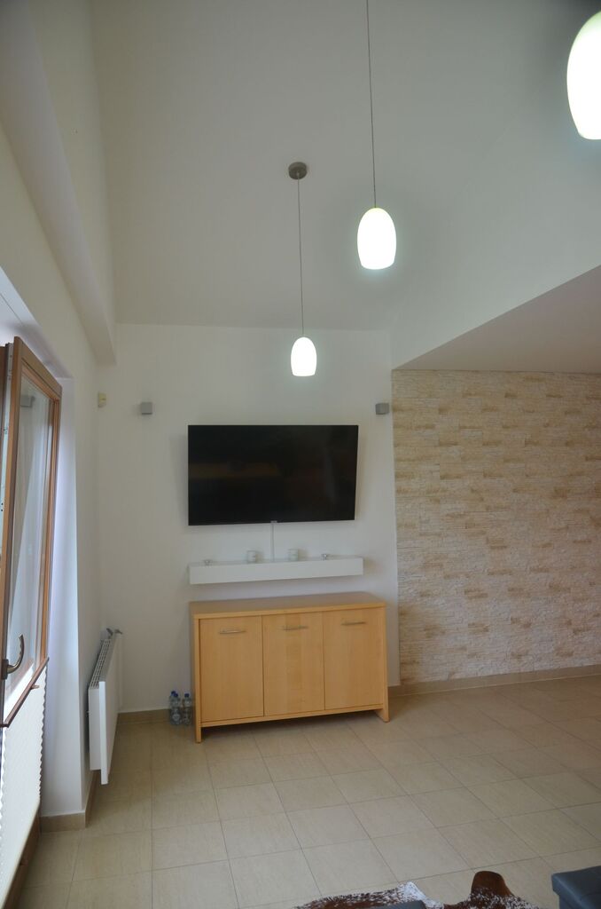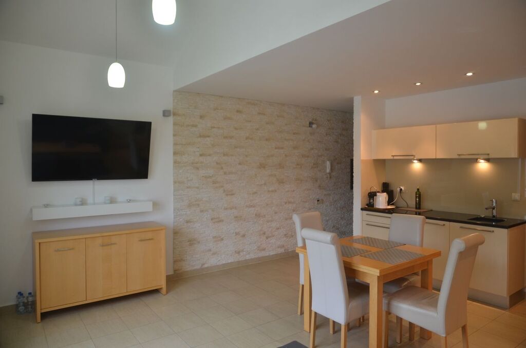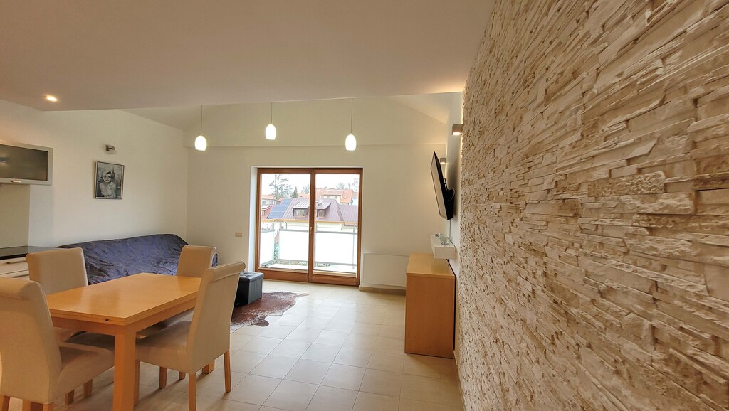 • Przestronny salon z aneksem kuchennym (ok. 25 m²) i wyjściem na tarasowy balkon częściowo z widokiem na morze. Dzięki częściowo otwartemu sufitowi wysokość pomieszczenia sięga aż 5 m, co dodaje wnętrzu niepowtarzalnej przestrzeni.