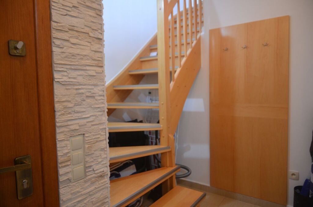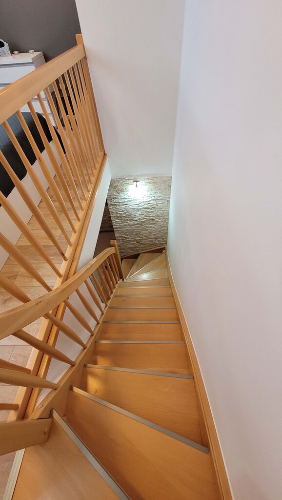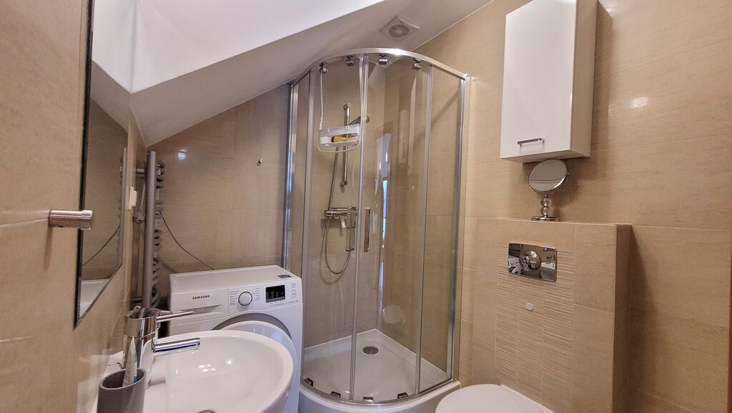 • Łazienka z WC (ok. 3 m²) – wykończona w glazurze i terakocie, wyposażona w kabinę prysznicową, pralkę oraz nowy elektryczny bojler.