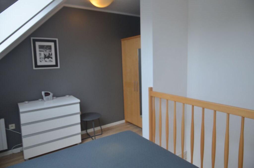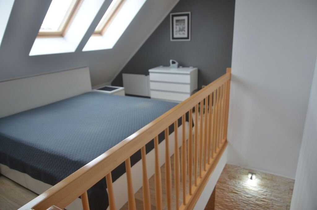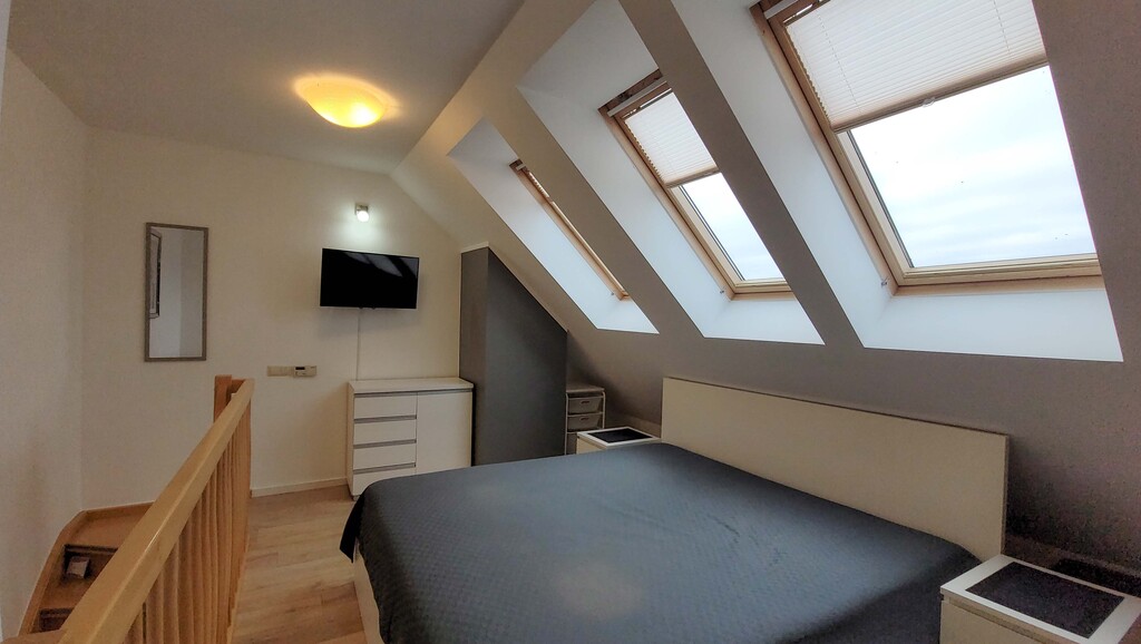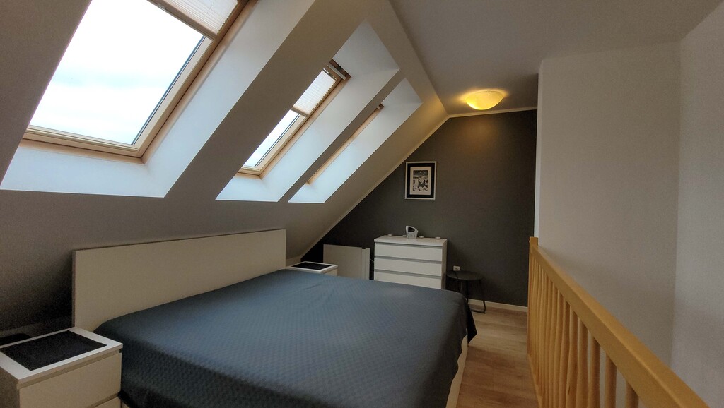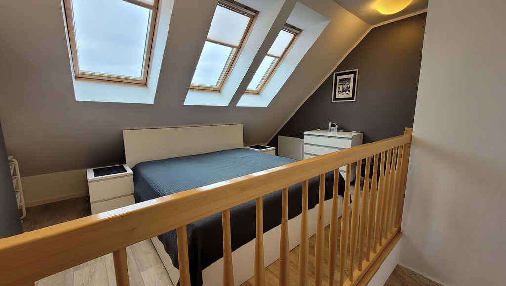 • Sypialnia (ok. 10 m²) z dużym łóżkiem oraz szafą. Na podłodze panele, okna połaciowe Velux (3-szybowe).