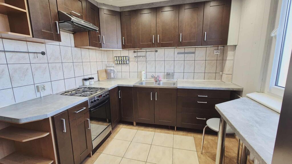 W pokojach na podłogach panele, na ścianach tapety. W przedpokoju na podłodze i ścianach panele. Na podłodze w kuchni terakota, na ścianach panele i pasek glazury między szafkami. W łazience na podłodze terakota, na ścianie plastikowe płytki. Wc w glazurze i terakocie. W cenie mieszkania pozostaje pełne wyposażenie!