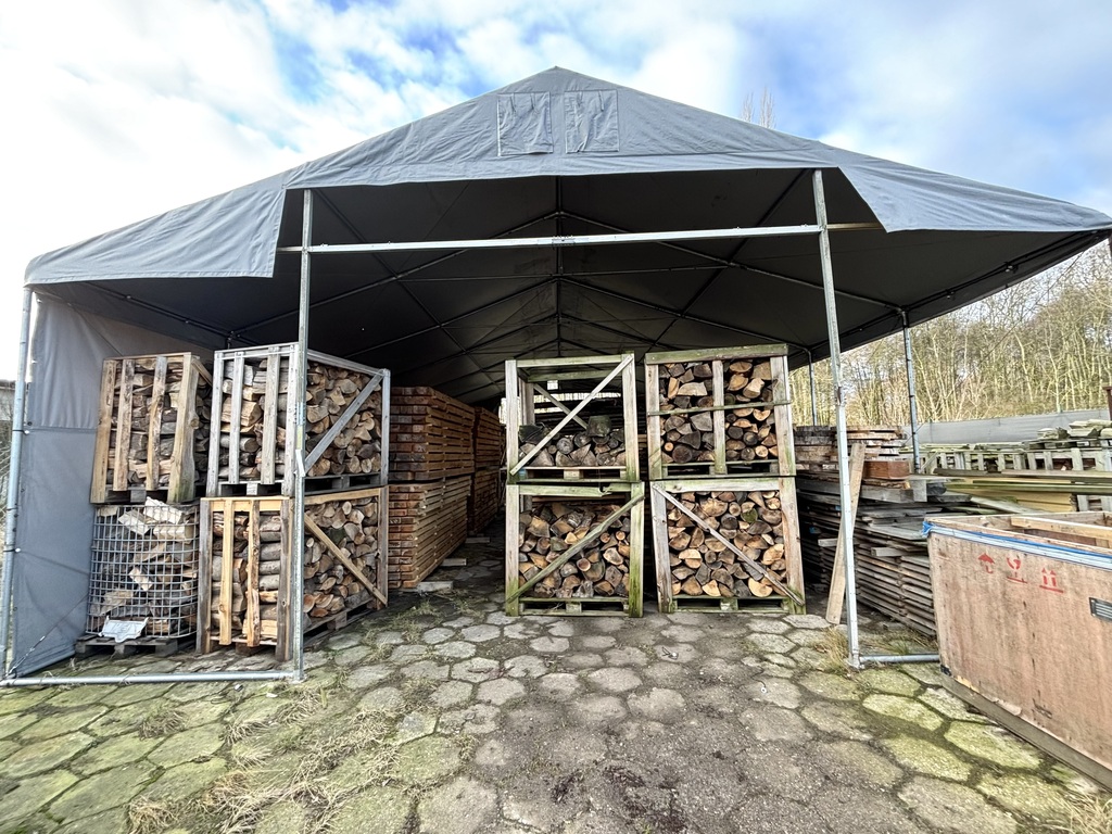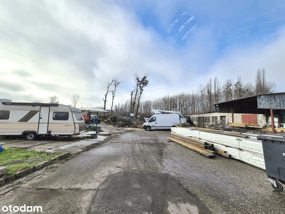Powierzchnia terenu wynosi 2562 m2, nieruchomość ogrodzona z bramą i monitoringiem. Na terenie( placu)znajduje się duży namiot, dwa traki oraz mix drewna również drewno wysuszone( drewno na opał, deski dąb, jesion, sosna, krokwie) itp.