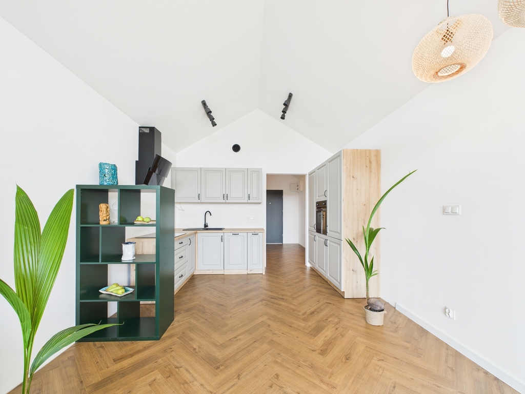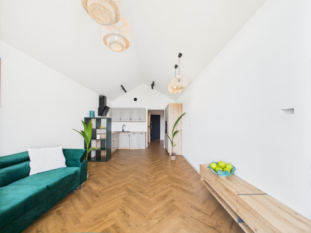 * Układ: salon z aneksem kuchennym, korytarz, łazienka z prysznicem walk-in