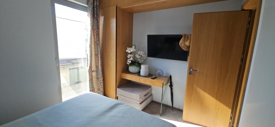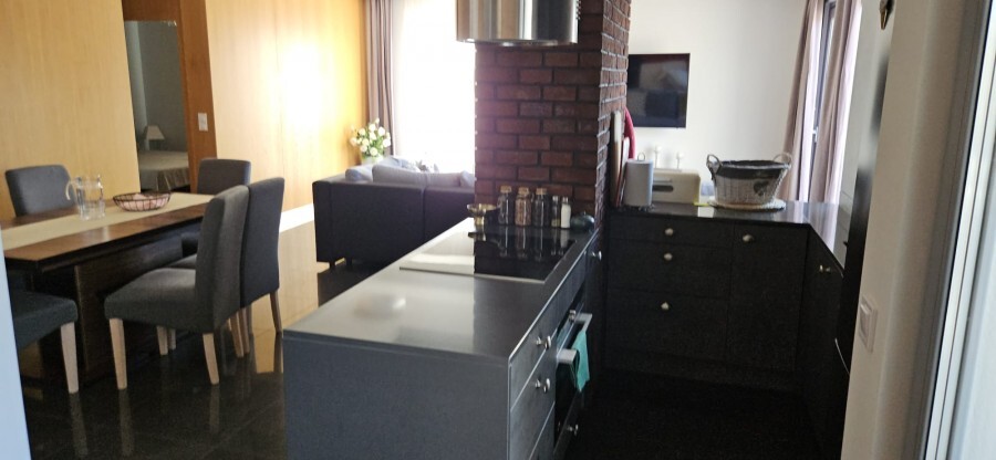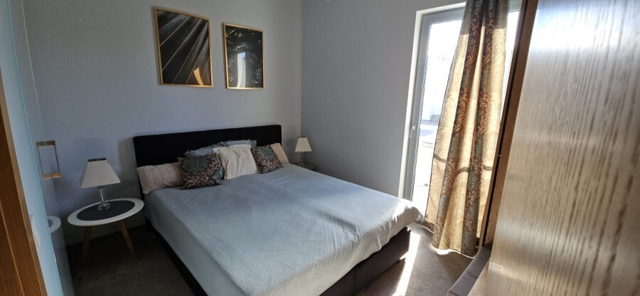 Przestronny salon z aneksem kuchennym łączy funkcjonalność z elegancją, a duże przeszklenia zapewniają doskonałe doświetlenie wnętrza. Dwie sypialnie i dwie stylowe łazienki sprawiają, że apartament jest idealny zarówno do prywatnego użytku, jak i do wynajmu premium.