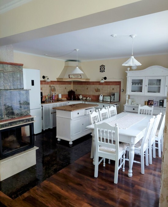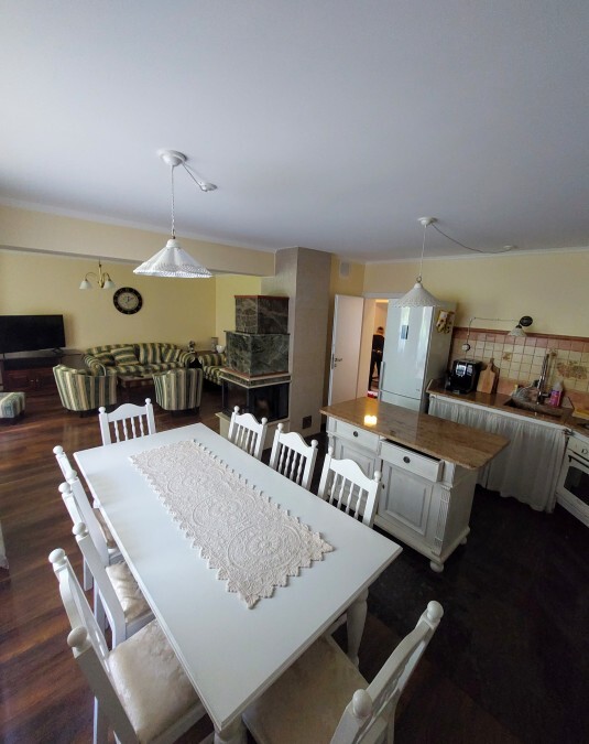 Duży dom ma powierzchnię 180m2, w którym znajduje się duża kuchnia z salonem 5 pokoi z łazienkami oraz pokój rozrywki ze stołem bilardowym.