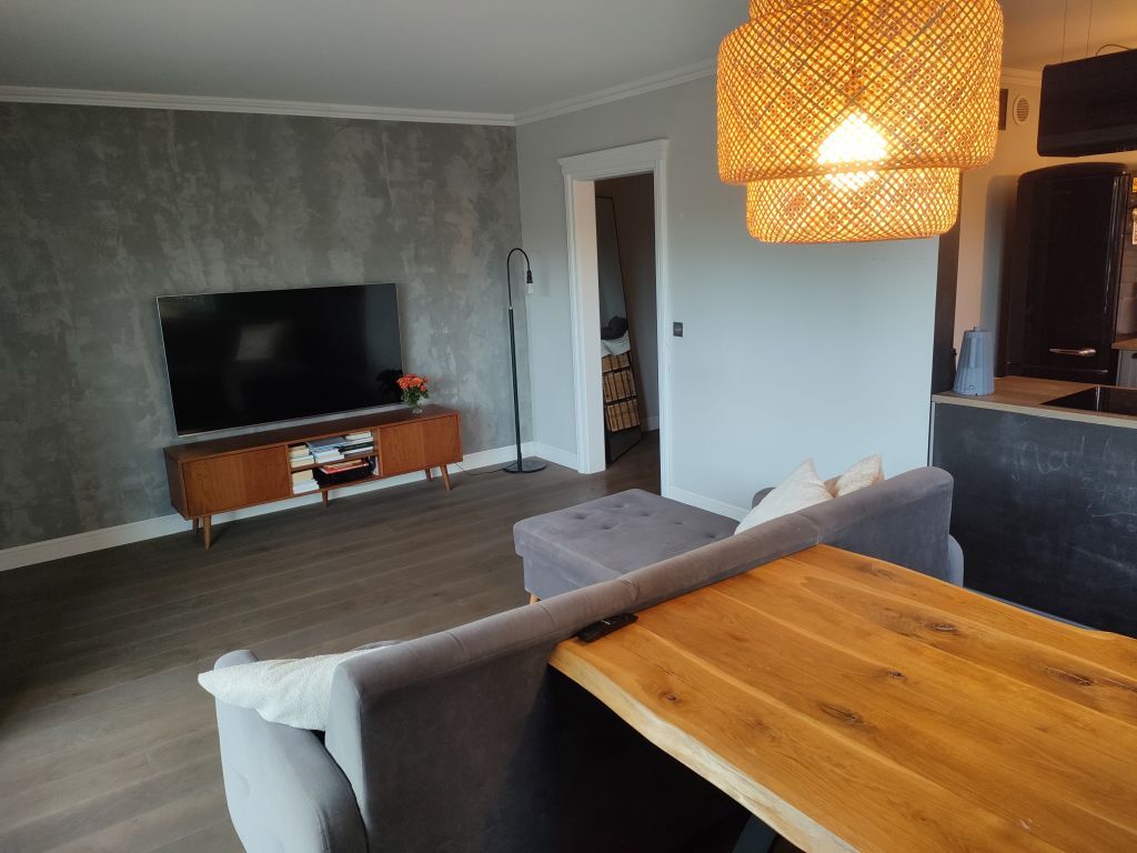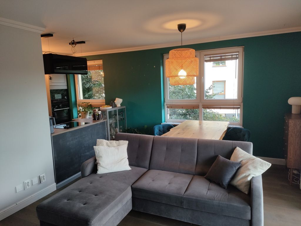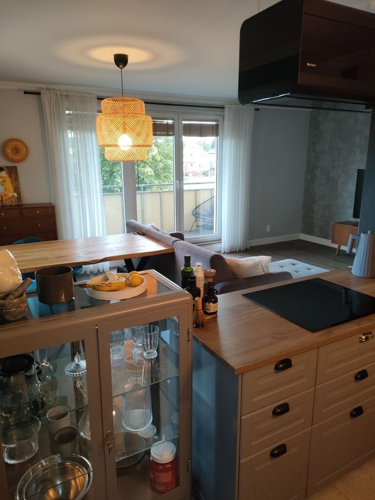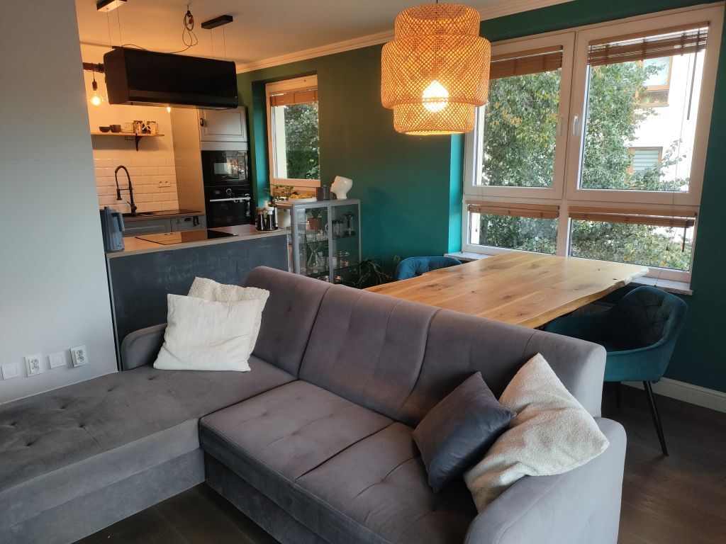 Kuchnia w mieszkaniu otwarta jest na ładny ustawny salon z wyjściem na duży taras.