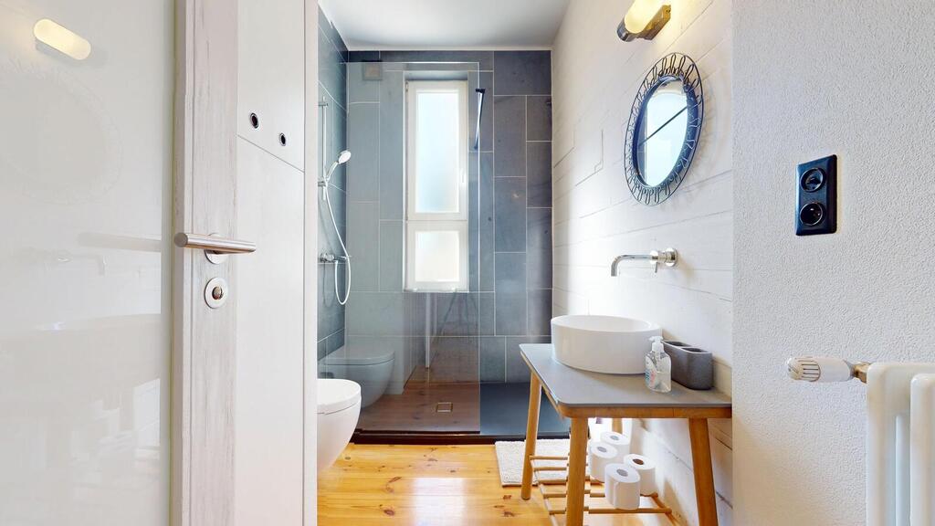 Drewniana podłoga i okna, ściany gładkie malowane, glazura i terakota.