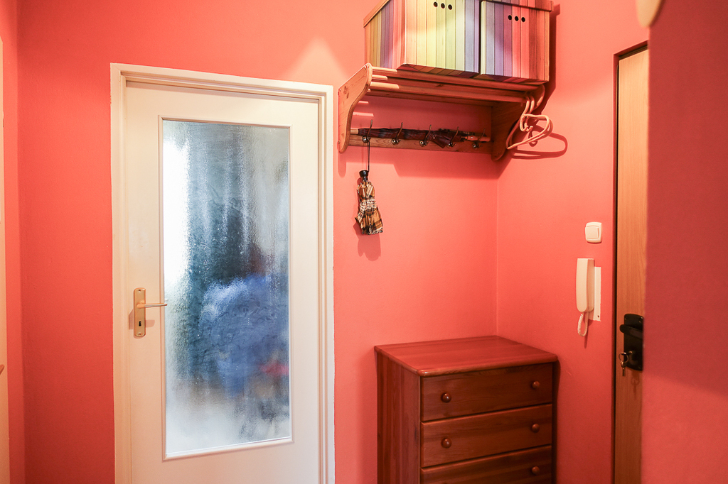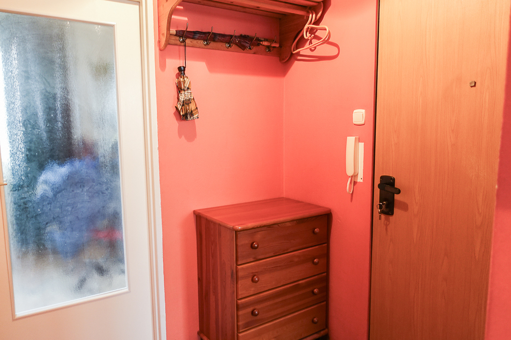 Drzwi wejściowe antywłamaniowe, Okna PCV. Wysokość mieszkania 2,58 m.