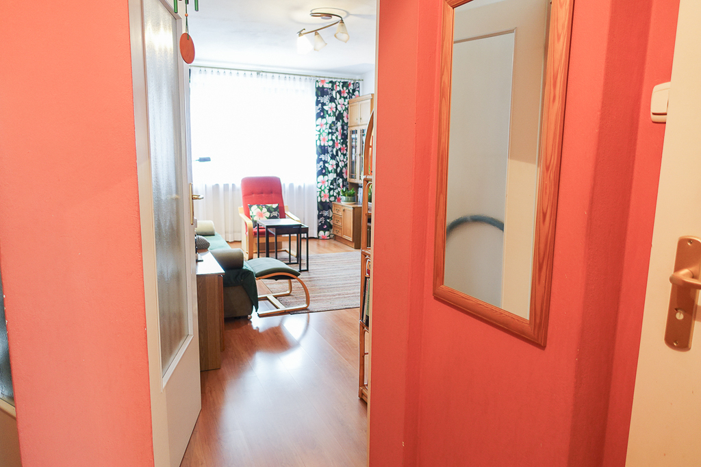 Przedpokój prawie kwadratowy o powierzchni 3,4 m2. Na podłodze panele.