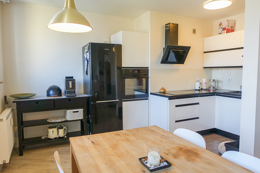 Kuchnia ma własne okno i można wrócić do poprzedniego układu stawiając ściankę. Kuchnia umeblowana i urządzona. Zabudowa meblowa biała, nowoczesna, sprzęt AGD: zmywarka, płyta indukcyjna, piekarnik elektryczny wbudowany, zlewozmywak jednokomorowy, pochłaniacz, lodówka wolno stojąca.