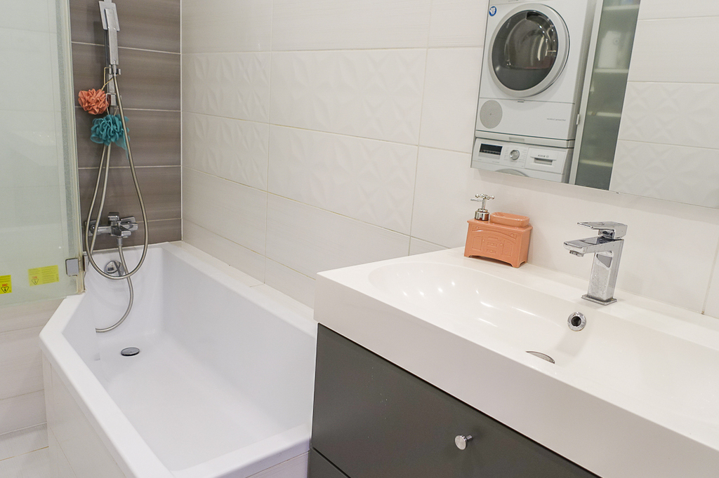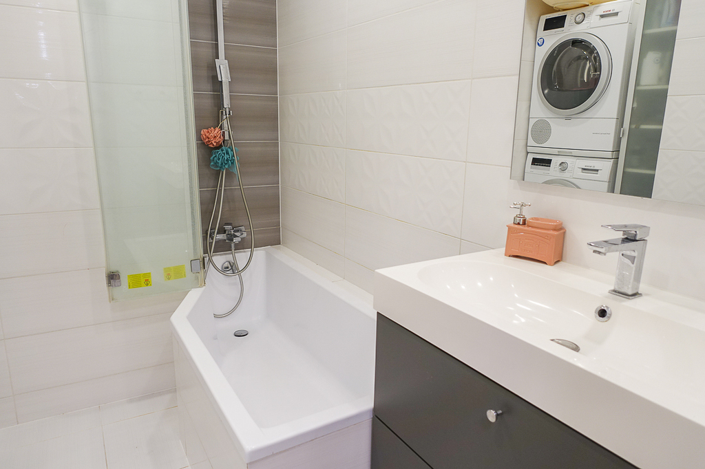 Łazienka ok. 6 m2 z wanną, umywalką, pralką i suszarką pozostającymi w mieszkaniu.
