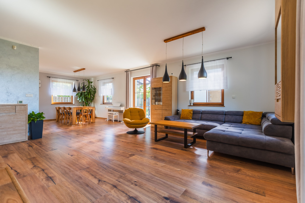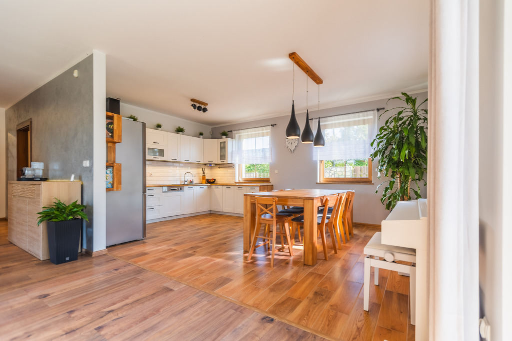 Przestronny salon z kominkiem z , kuchnią i jadalnią tworząc otwartą przestrzeń, toaleta, holl i pomieszczenie techniczne (kotłownia z piecem gazowym dwuobiegowym i zasobnikiem na ciepłą wodę).