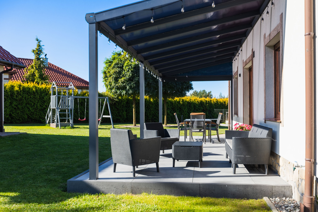 Z salonu wyjście na dwa tarasy w tym jeden zadaszony nowoczesna pergolą.