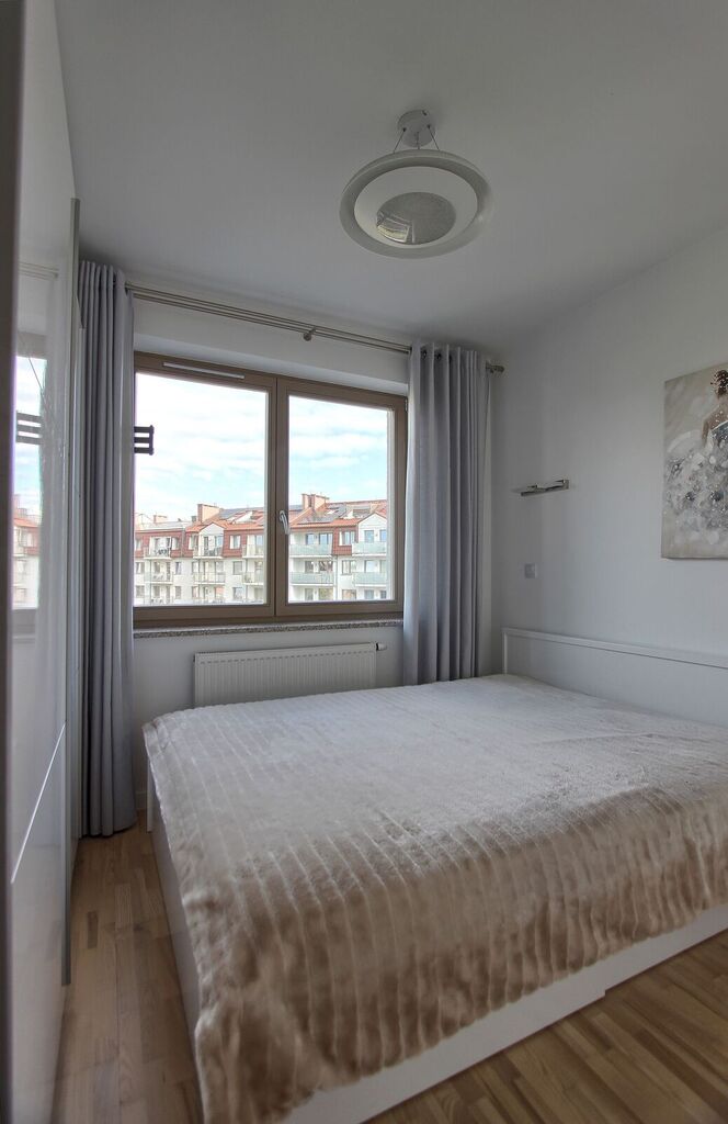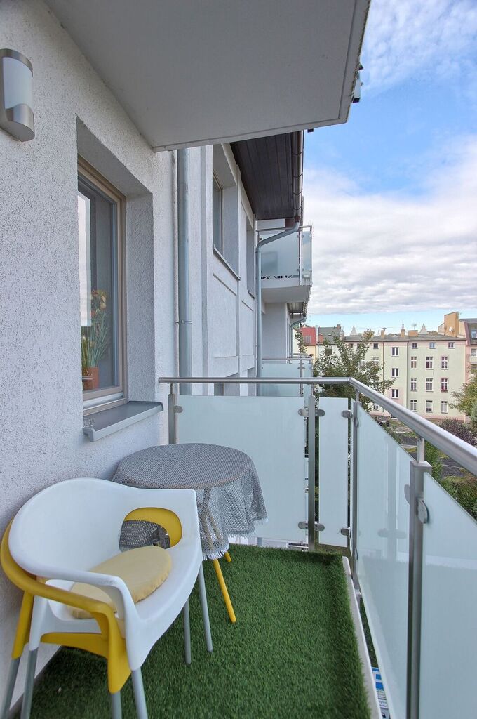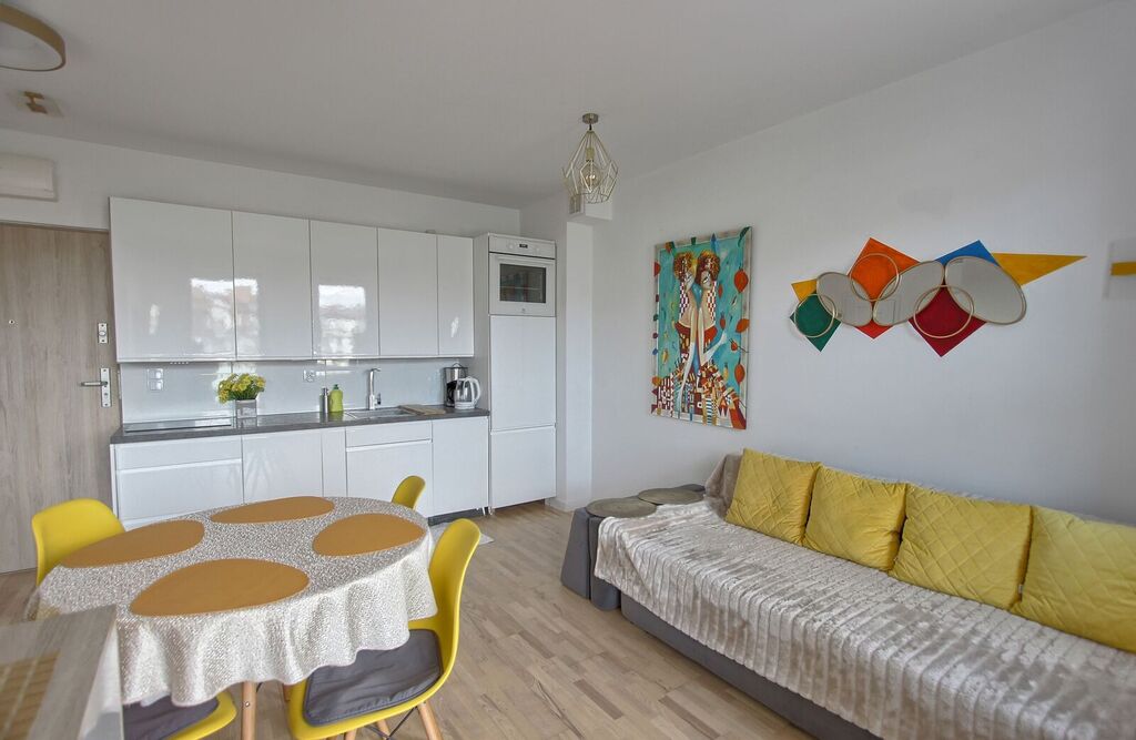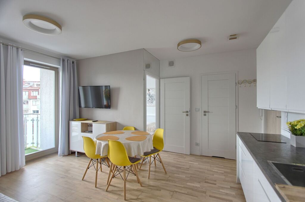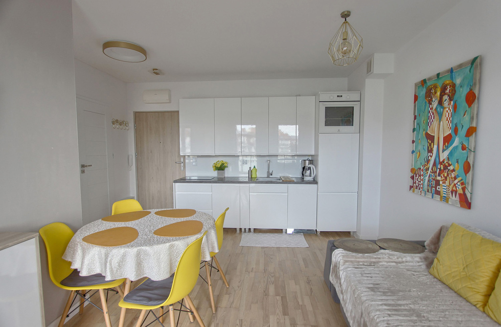 Mieszkanie jest wyjątkowo ciche i przytulne, ponieważ okna wychodzą na wewnętrzny dziedziniec. Dzięki temu panuje tu spokój, mimo że osiedle znajduje się blisko centrum atrakcji turystycznych. Do plaży i promenady można dojść w około 10 minut spacerem, a w pobliżu znajdują się restauracje, kawiarnie i Park Zdrojowy.