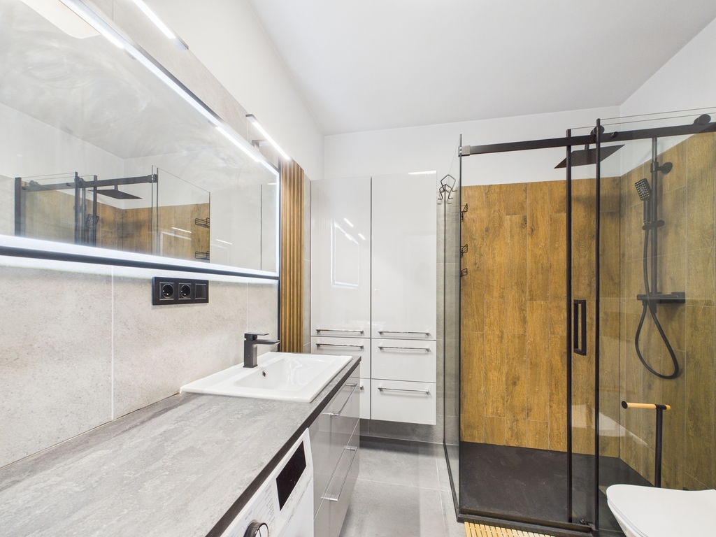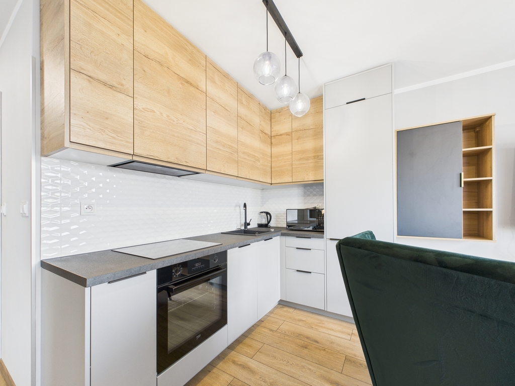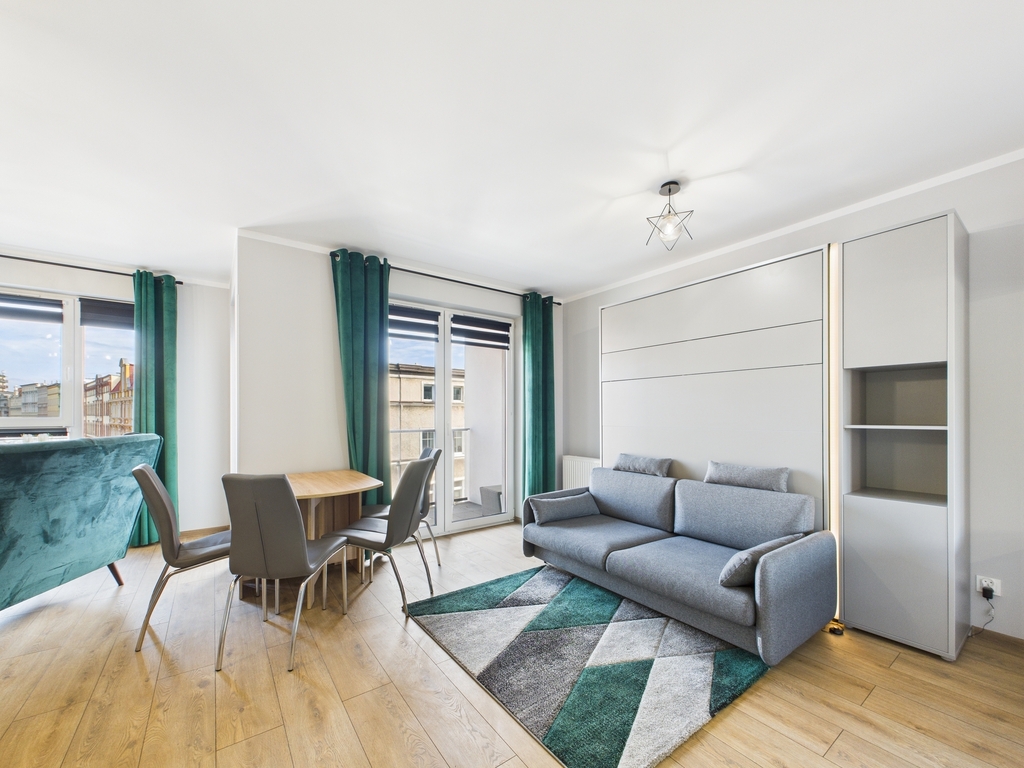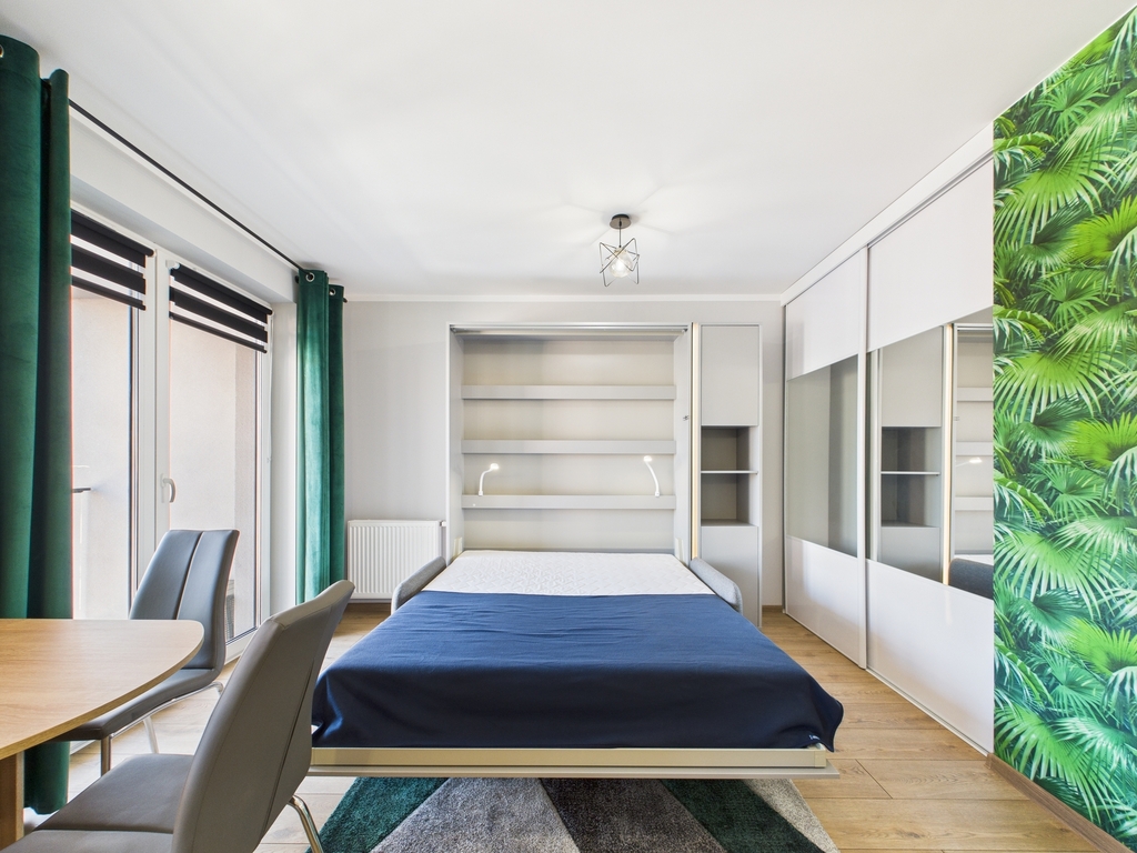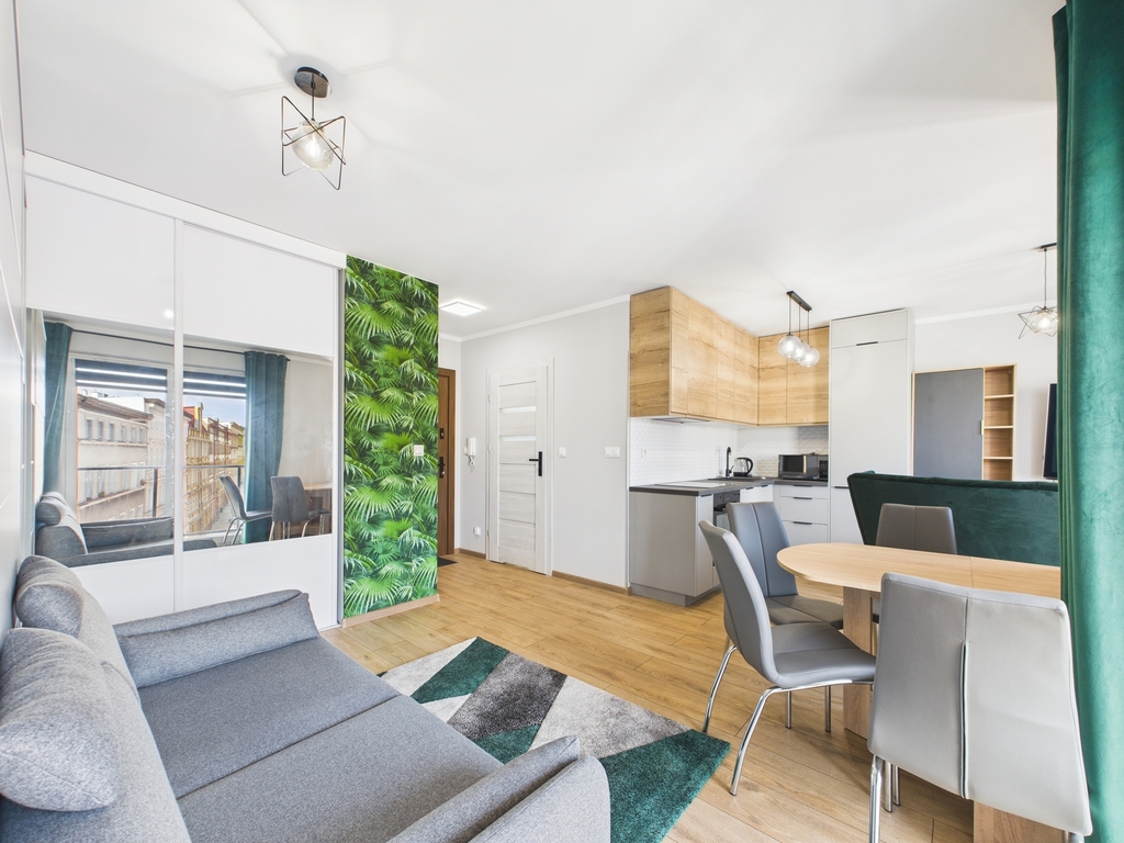 W mieszkaniu zadbano o wszystkie szczegóły i detale. Dla wygody przyszłych najemców zamontowana została w salonie kanapa, która przekształca się w pełnowymiarowe łóżko do spania. Poza szafą z siedziskiem w zabudowie w przedpokoju znajdziemy tutaj garderobę, która pozwoli na kompaktowe przechowywanie rzeczy.