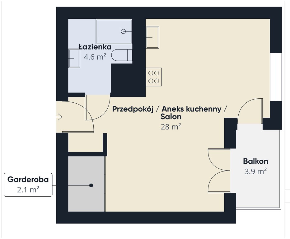 -salon z wydzieloną częścią rekreacyjną i sypialnianą, z którego mamy wyjście na loggie
