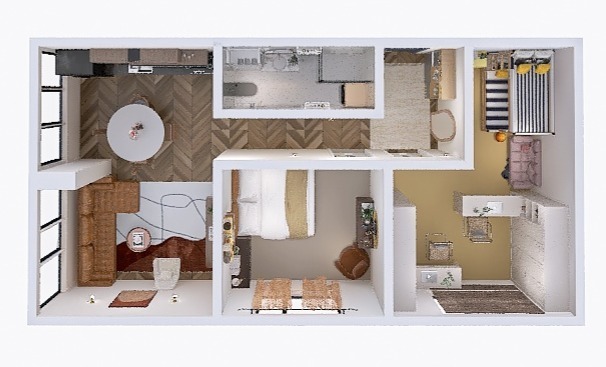 * W ogłoszeniu użyto poglądowych wizualizacji mających na celu zaprezentowanie potencjału aranżacyjnego mieszkania po remoncie - wg rzutu pokazującego układ salon z aneksem oraz 2 sypialnie.