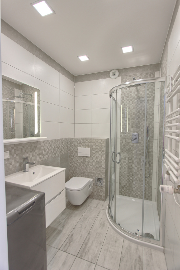 Łazienka razem z wc, wyposażona w kabinę prysznicową, pralkę.