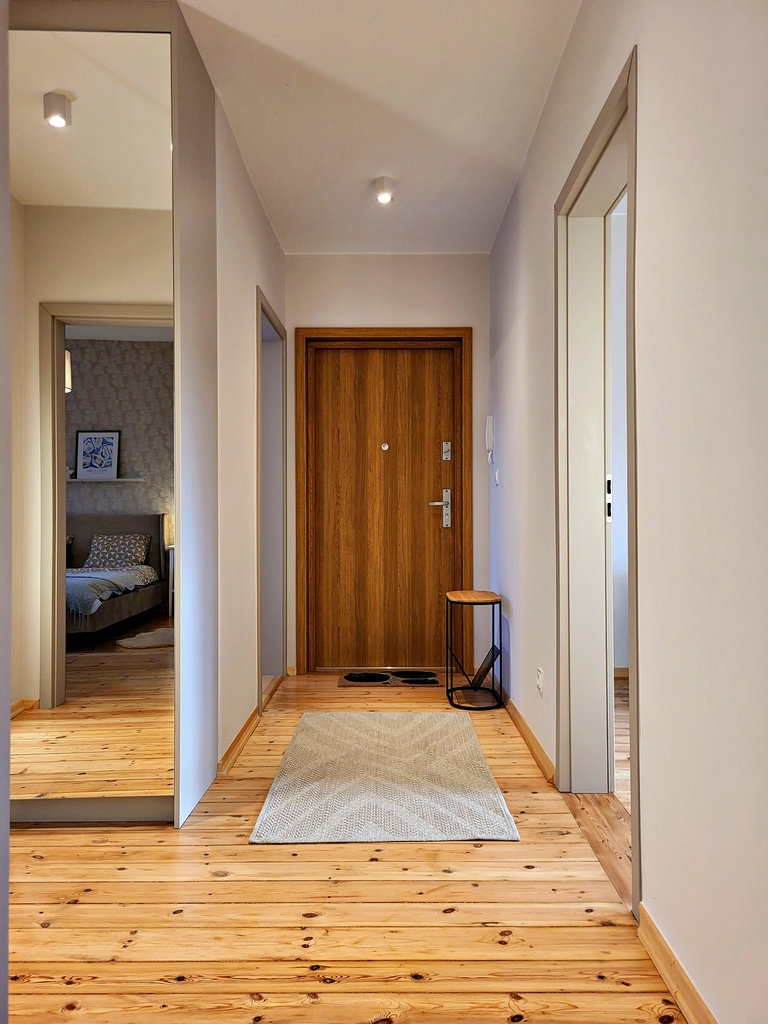 Dodatkowo mieszkanie posiada chowane schody na poddasze które stanowić może dodatkową przestrzeń do przechowywania.