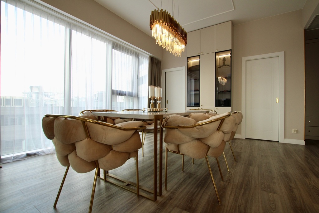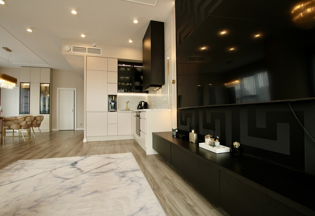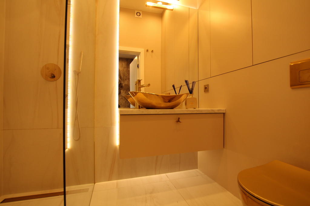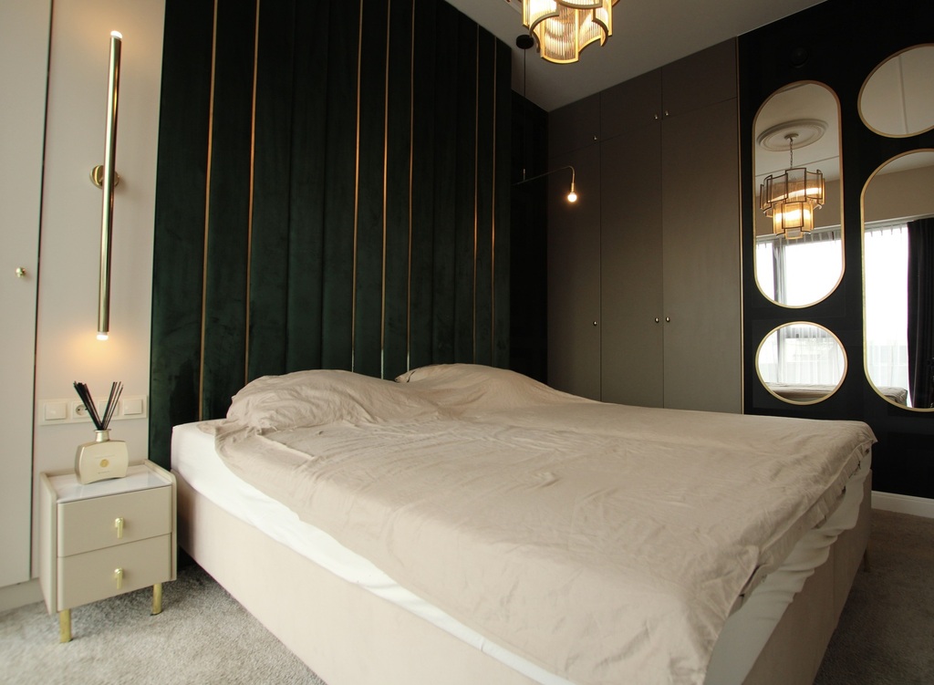 Wnętrze apartamentu zaprojektowano w stylu nowoczesny glamour z nutą art déco z najwyższej jakości materiałów – aksamitne tkaniny, złote wykończenia, naturalne drewno i designerskie oświetlenie oraz stylowe tapety tworzą wyjątkową całość. Każdy element ma tu swoje miejsce – nieprzypadkowy i dopracowany.