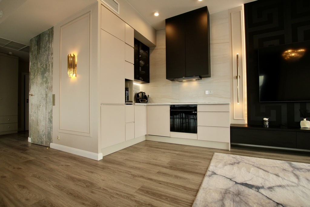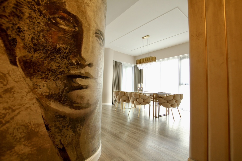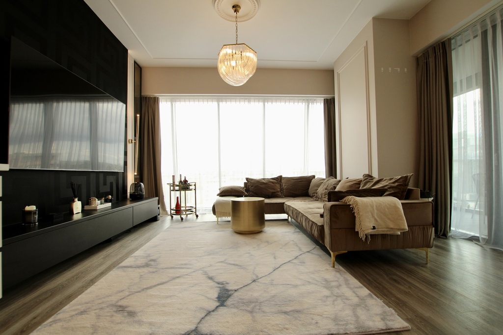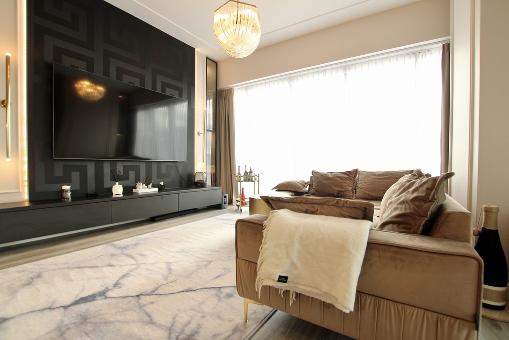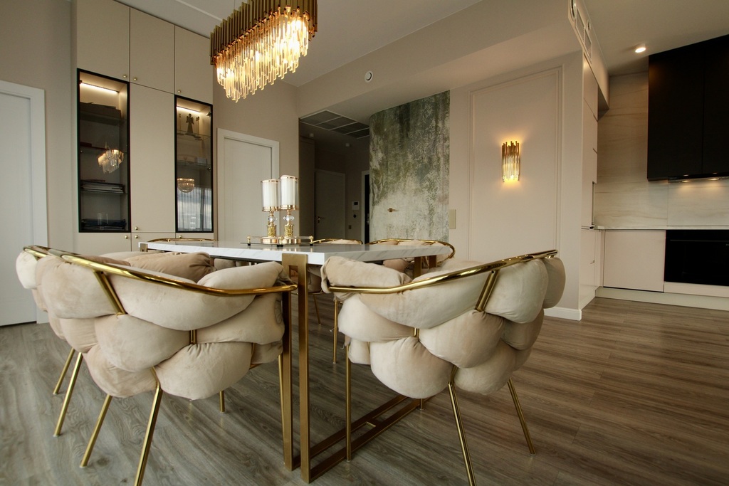 Wnętrze apartamentu zaprojektowano w stylu nowoczesny glamour z nutą art déco z najwyższej jakości materiałów – aksamitne tkaniny, złote wykończenia, naturalne drewno i designerskie oświetlenie oraz stylowe tapety tworzą wyjątkową całość. Każdy element ma tu swoje miejsce – nieprzypadkowy i dopracowany.