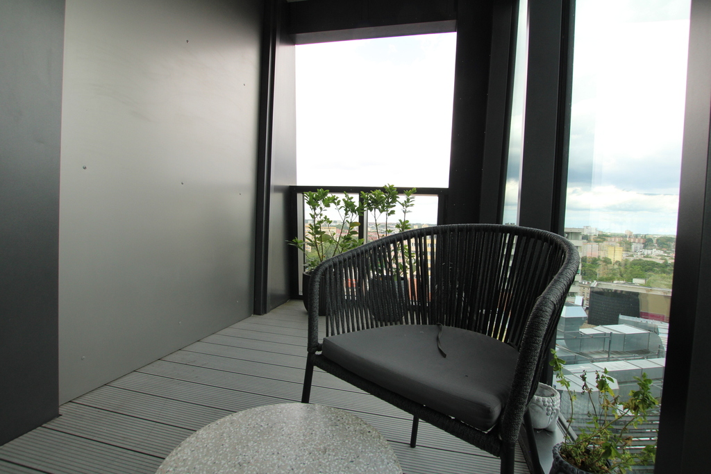 - Przeszkloną loggię, z której rozciąga się widok na panoramę miasta