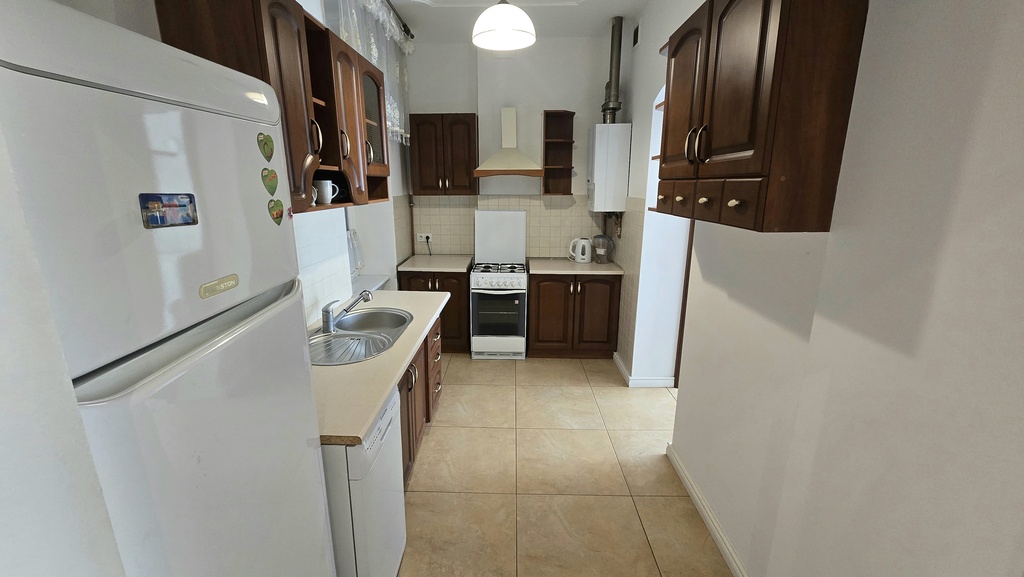 Pokoje wyposażone, kuchnia w zabudowie ze sprzętem AGD. Podłogi w pokojach wyłożone panelami, w kuchni i korytarzu kaflami. Łazienka wykończona w glazurze i terakocie. Ogrzewanie i ciepła woda z pieca gazowego. Za budynkiem dostępne miejsca parkingowe.