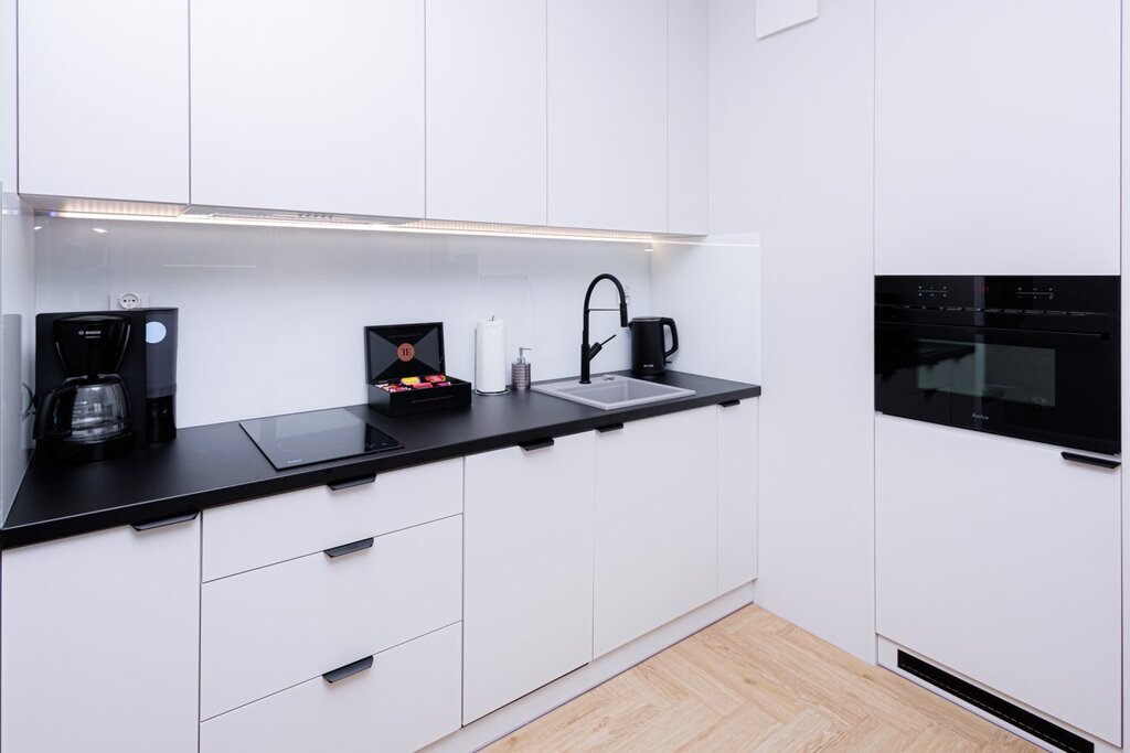 Apartament od strony północno-wschodniej na 10 piętrze składa się z pokoju dziennego z aneksem kuchennym, sypialni oraz łazienki z wc.