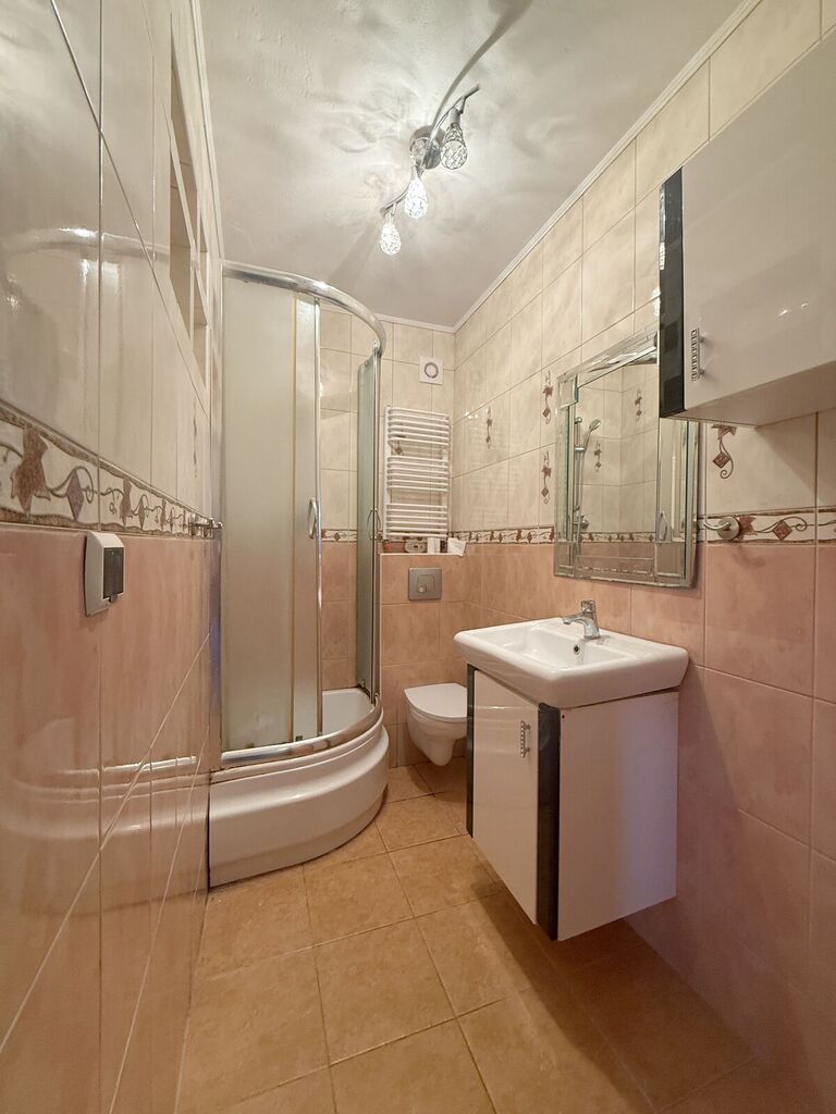 Łazienka na piętrze i toaleta na parterze w glazurze i terakocie.