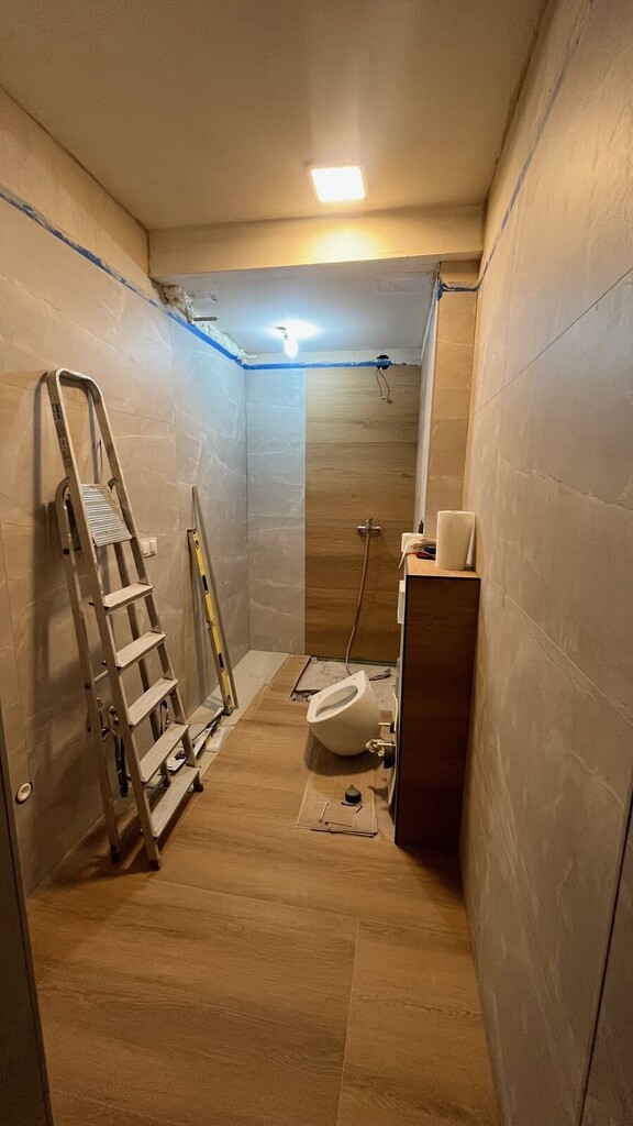 Na podłodze panele i kafle, ściany gładzone malowane.
