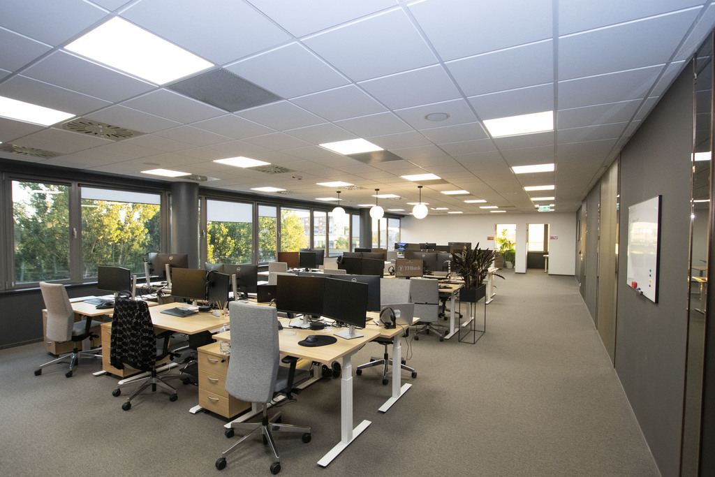 Układ powierzchni to funkcjonalny open space z możliwością wydzielenia gabinetów, sal konferencyjnych i stref relaksu. Duże przeszklenia zapewniają dostęp naturalnego światła oraz atrakcyjny widok na panoramę miasta. Standard wykończenia