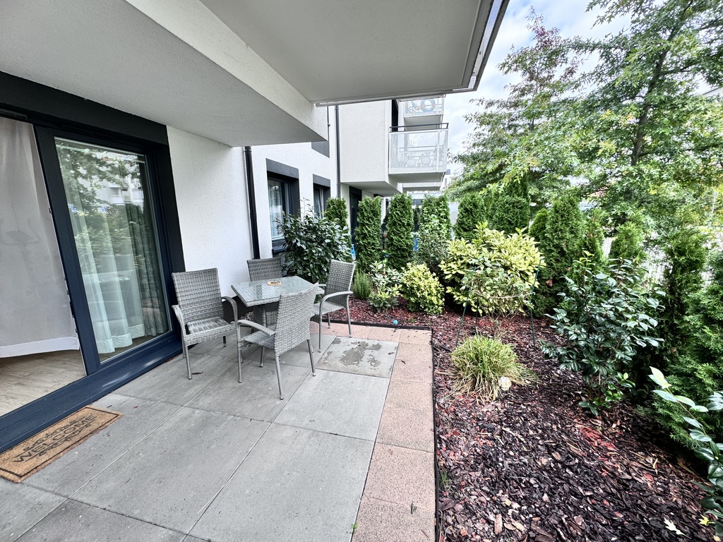 • salon z aneksem kuchennym i wyjściem na pięknie zagospodarowany, zielony ogródek o powierzchni 34m2,