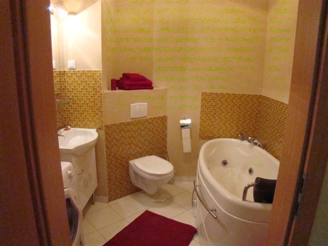 W łazience glazura i terakota, wanna z hydromasażem, umywalką i wc.