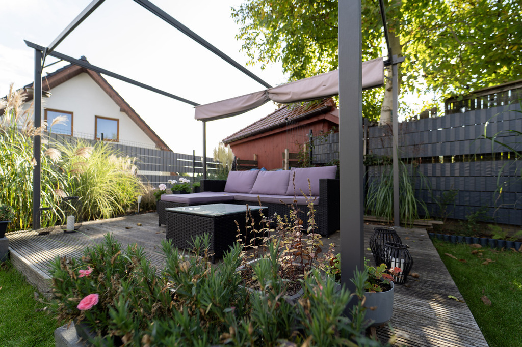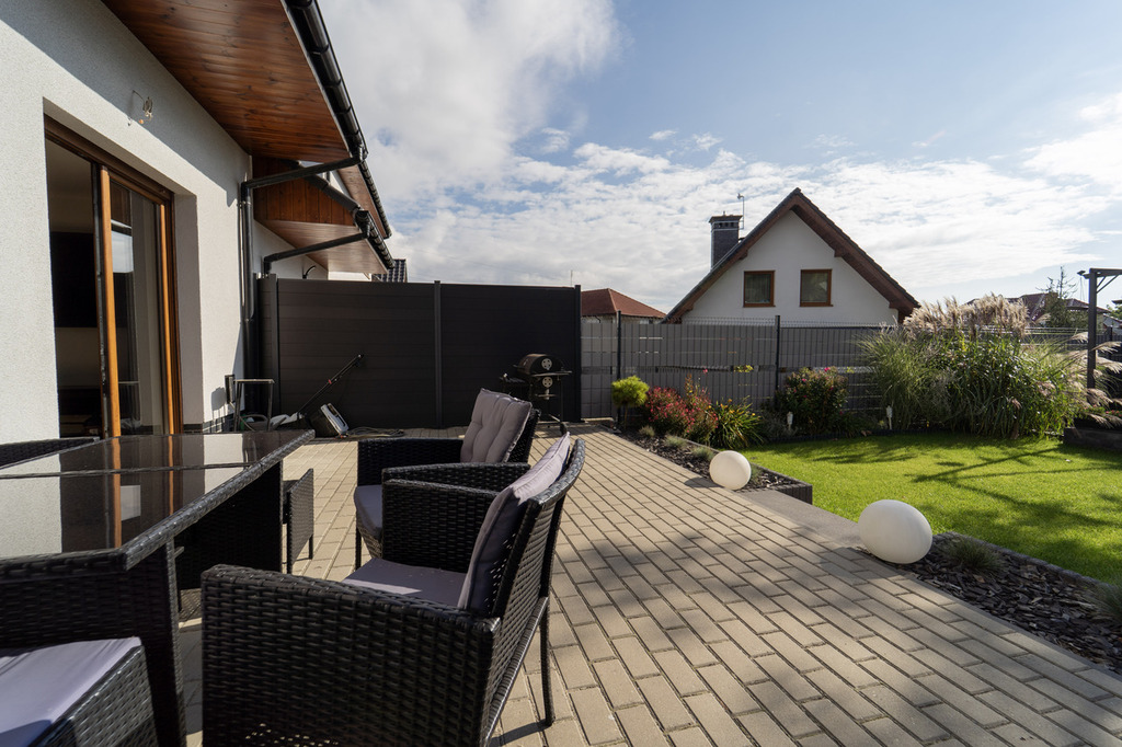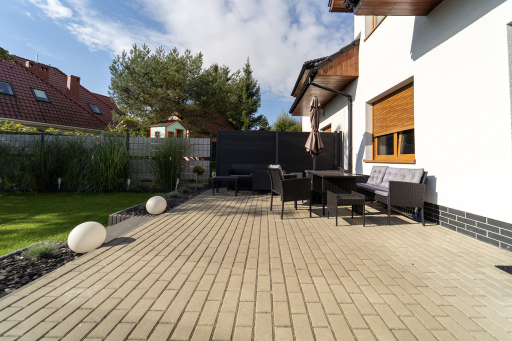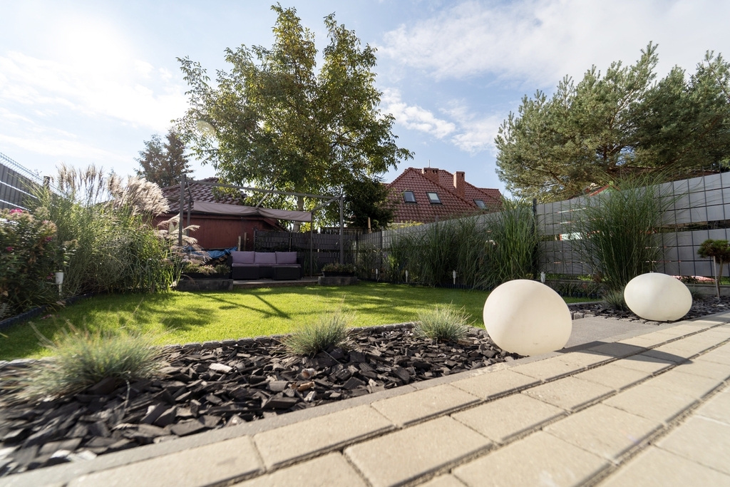 Przy domu znajduje się piękny ogród z licznymi nasadzeniami i wygodny taras wykonany z kostki brukowej – idealne miejsce na relaks i spotkania z rodziną.