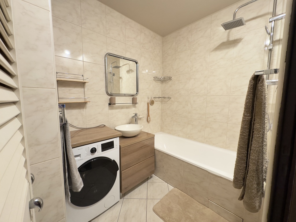 * łazienka wyposażona w wannę z funkcją prysznica, umywalkę i pralkę