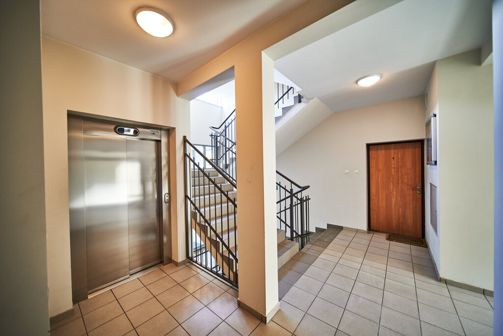 Przestronny przedpokój z miejscem na szafy w zabudowie.