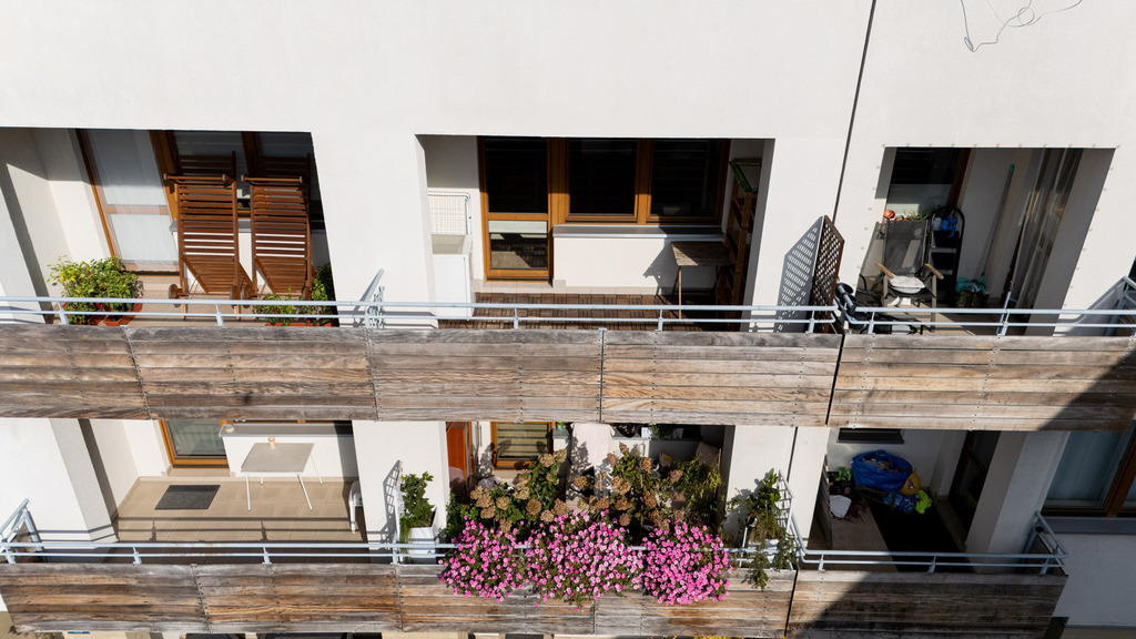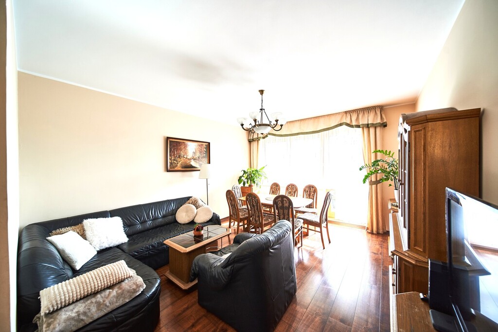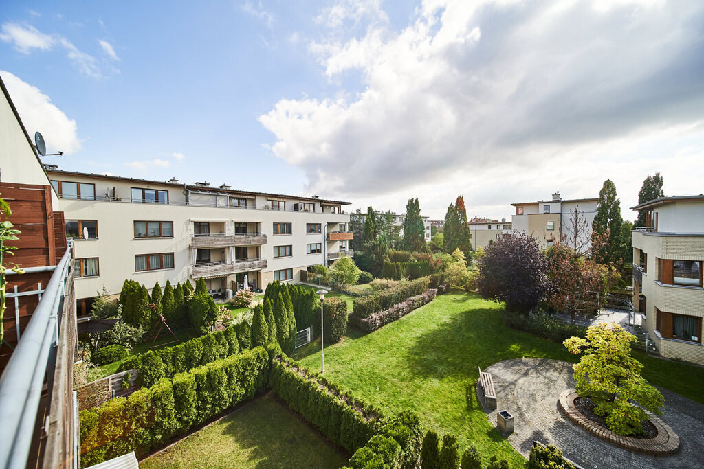 Przestronny salon (ok 19 m2) z wyjściem na duży (5,5 m2), słoneczny balkon (ekspozycja południowa) – z widokiem na zadbane patio pełne zieleni.