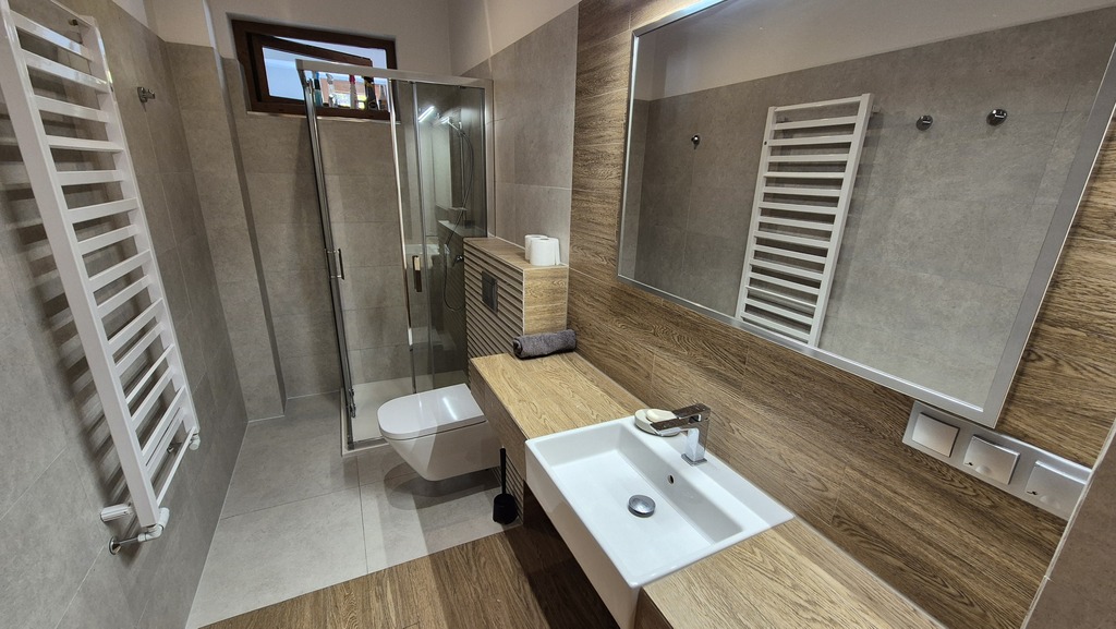 * łazienka (ok. 5 m2) z kabiną prysznicową, wc i umywalką;