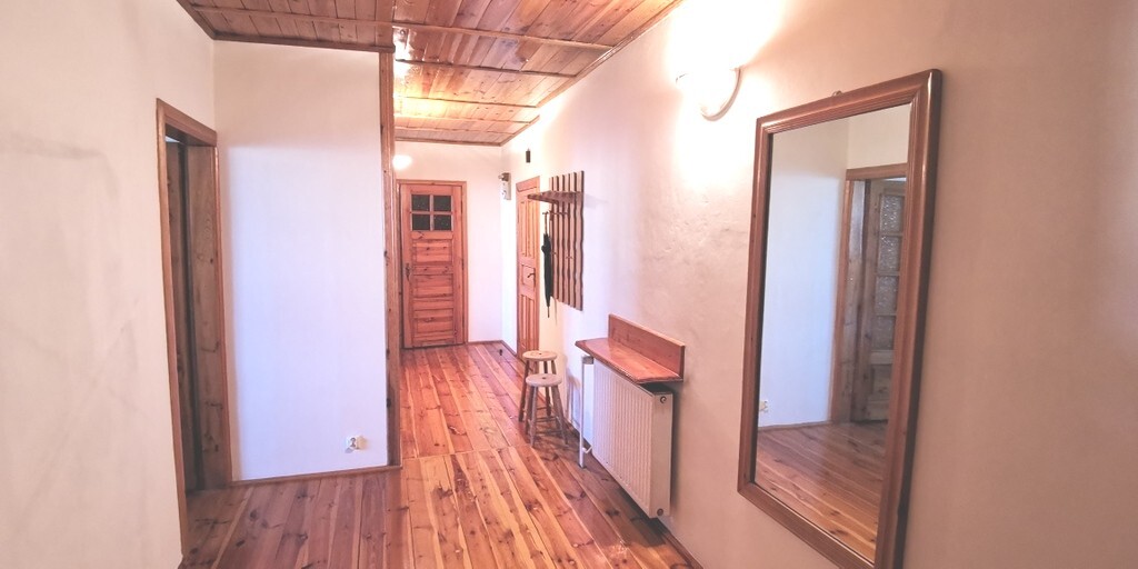 W pokojach i przedpokoju na podłogach gruba, wycyklinowana deska. Drzwi wewnętrzne drewniane. Sufity i skosy obłożone deską.