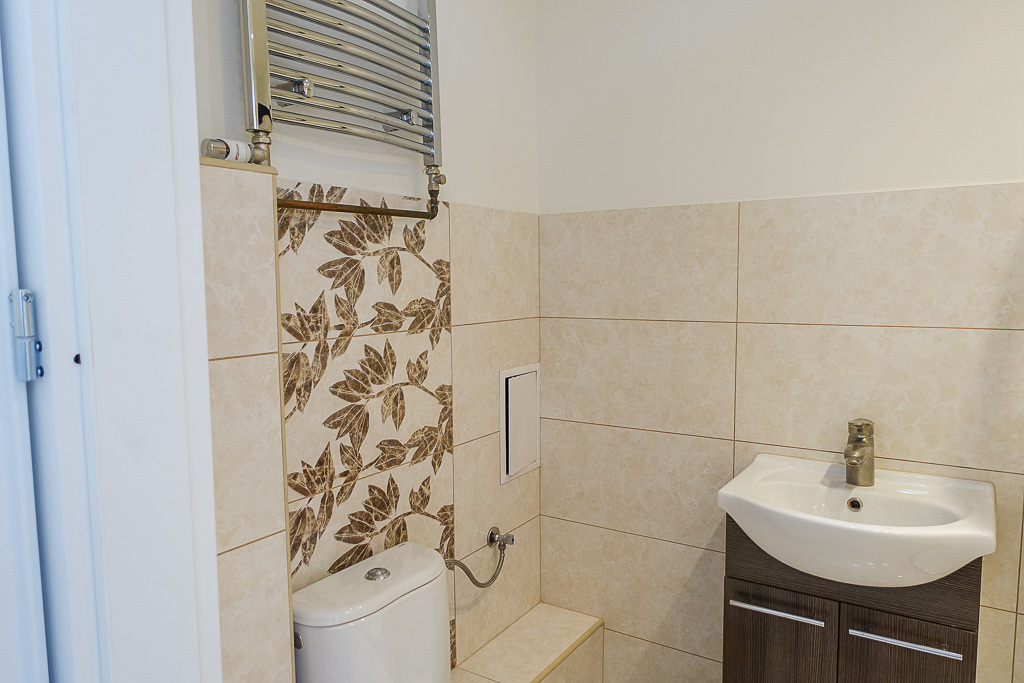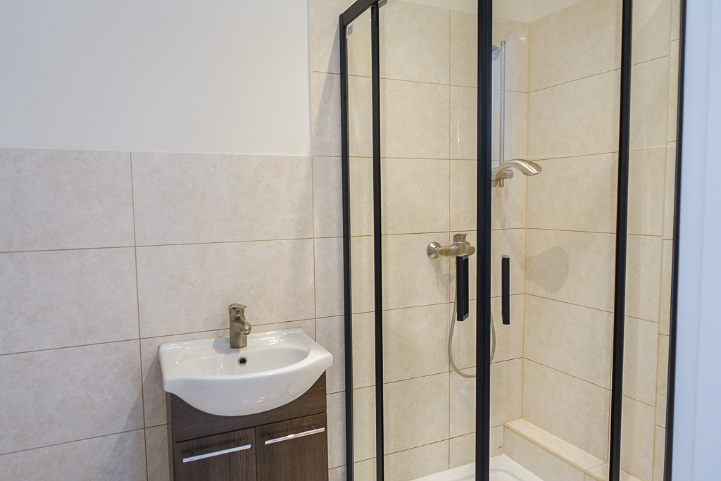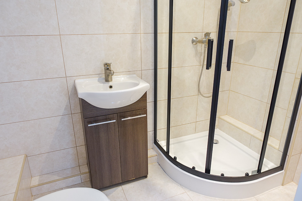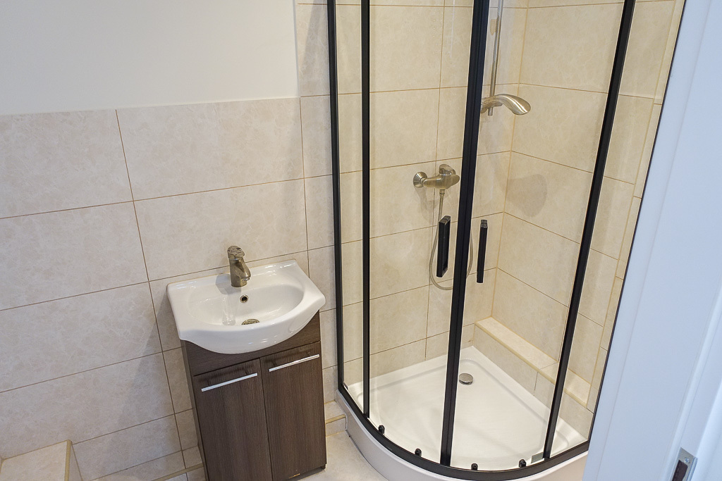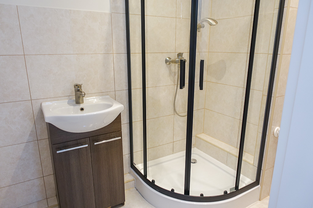 W łazience glazura i terakota, nowa kabina prysznicowa z armaturą.