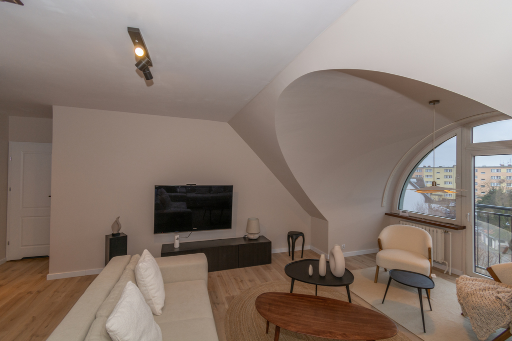 Mieszkanie po generalnym remoncie składa się z dwóch poziomów. Urządzone ze smakiem, bardzo dobrze doświetlone.