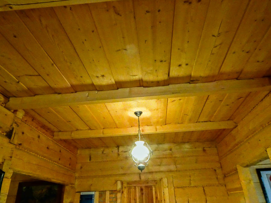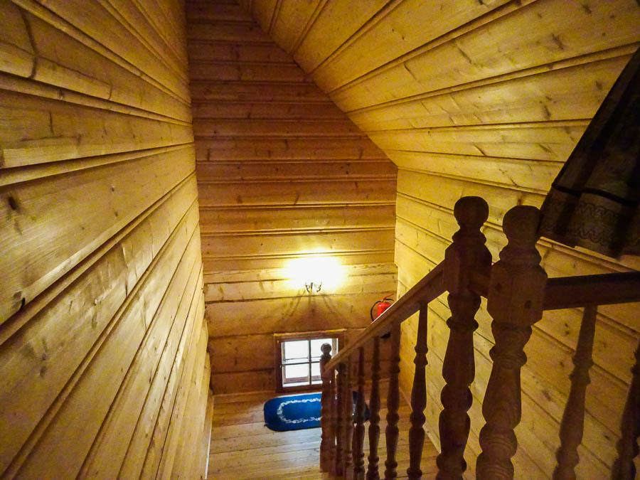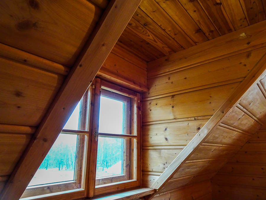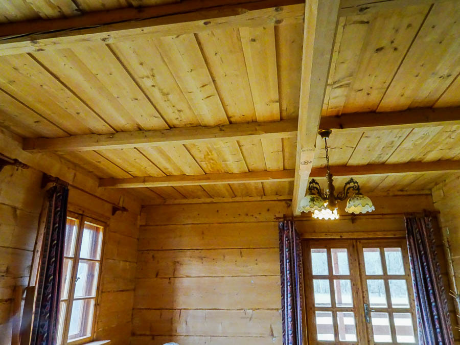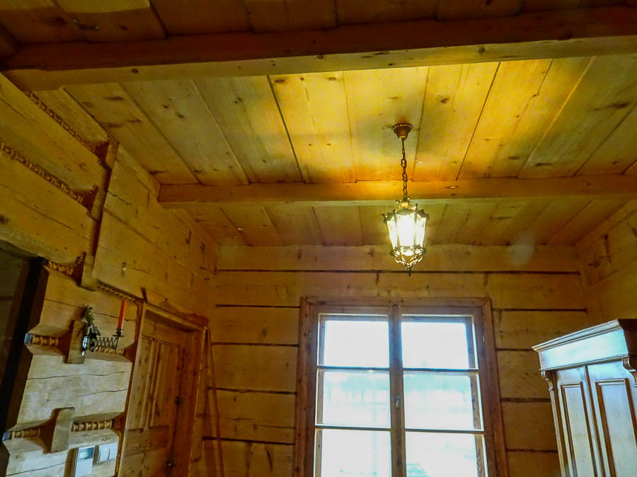 PIĘTRO: powstało prawie w całości z elementów z przeniesionego domu góralskiego. Bale z drewna smrek tatrzański, podłoga świerkowa, na suficie oryginalne deski, okna z modrzewia. Salon o powierzchni 30,13 m2, z czynnym kominkiem żeliwnym, nowym obłożonym kamieniem, sypialnia 22,94 m2, dodatkowo łazienka 5,31 m2, z oknem w glazurze i terakocie, a w niej wanna, umywalka, WC razem. Z sypialni wyjście na balkon.