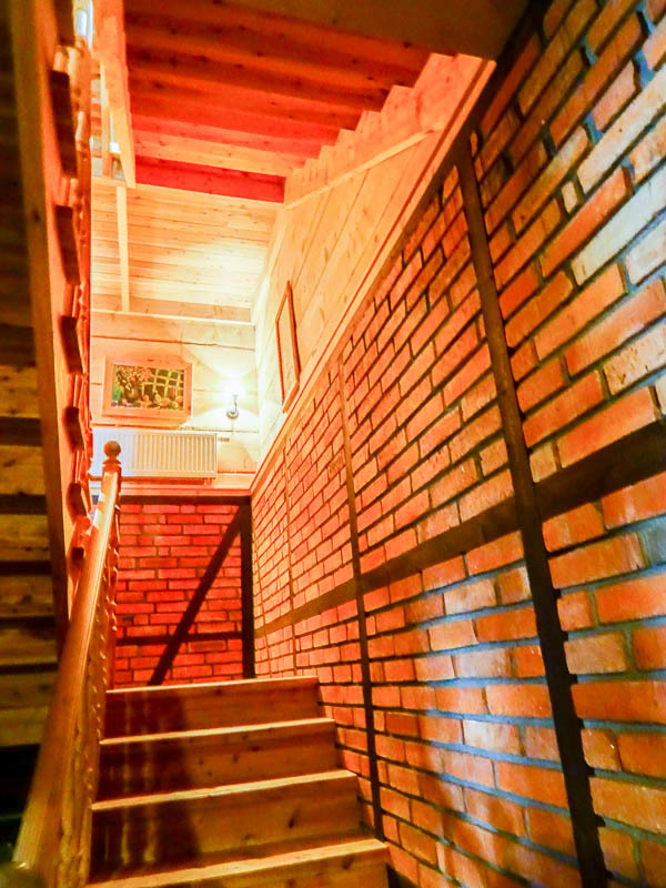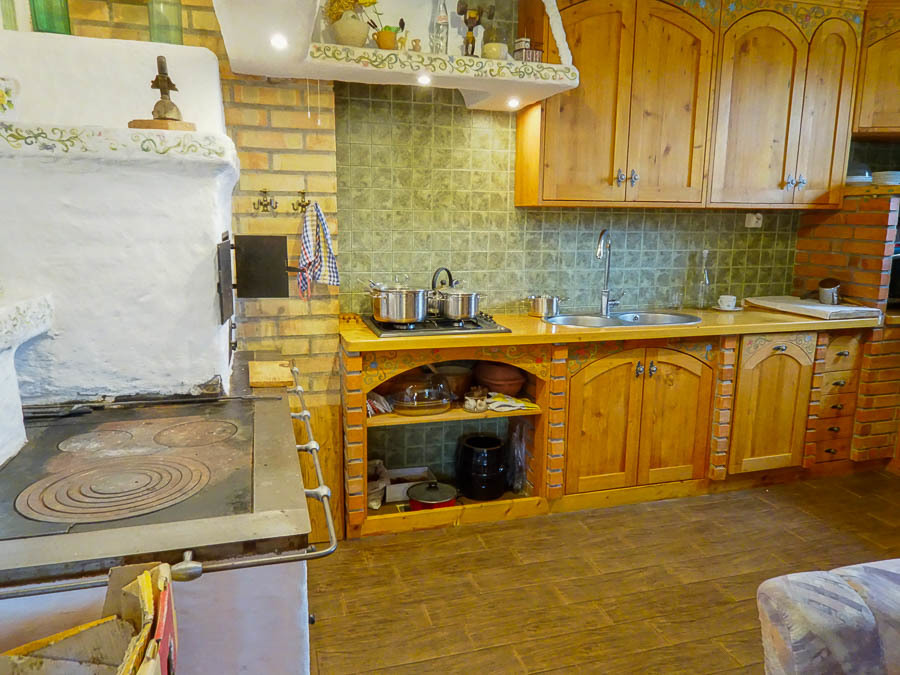 POZIOM ZEROWY: powstał z nowych materiałów (porotherm 25 cm, ocieplony styropianem 10 cm z elementami historycznymi (okładzina z kamienia łupanego 15 cm. Kuchnia z jadalnią 36 m2 mieści obszerny drewniany stół oraz piec chlebowy wraz z zabudową meblową i współczesnymi urządzeniami AGD (lodówka, kuchenka gazowa 4 -palnikowa, piekarnik, zlewozmywak, zmywarka). Ponadto łazienka o powierzchni 5,02 m2 z oknem w glazurze i terakocie z elementami z ozdobnej, nowej cegły. 3 pomieszczenia gospodarcze.