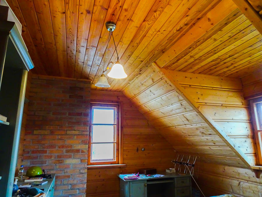 PODDASZE: z nowych materiałów w nim 3 pokoje 19,33 m2, 13,58 m2, 11,67 m2 komunikacja 18,91 m2 + gabinet 4,03 m2, który może być garderobą, łazienka 5,29 m2 z kabiną prysznicową i oknem. W pokojach nowe deski ze świerka, okna i sufity modrzewiowe.