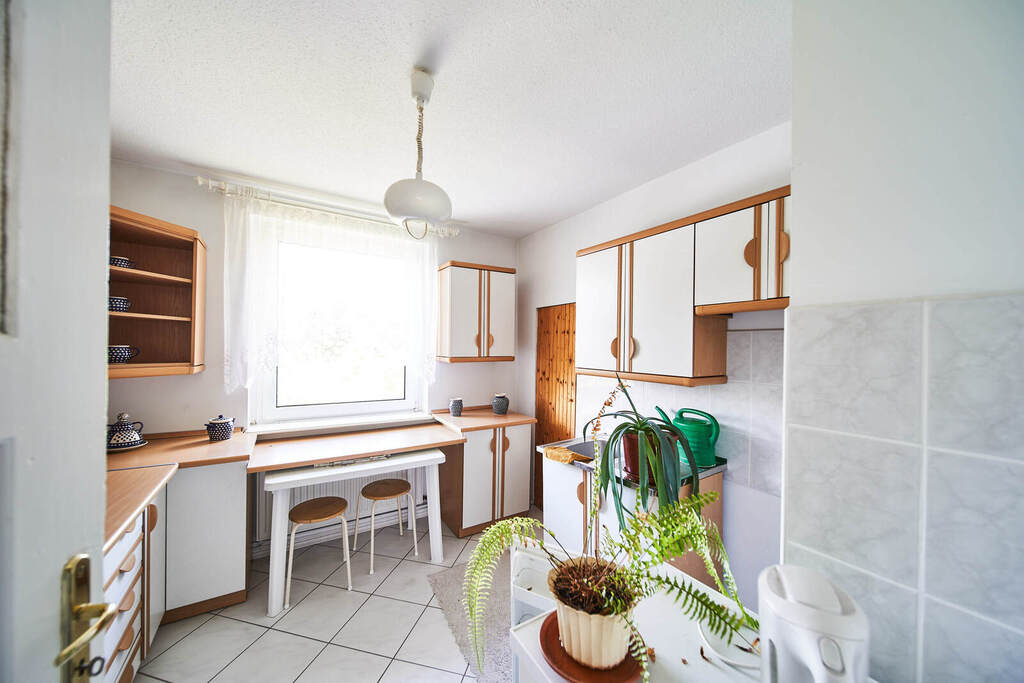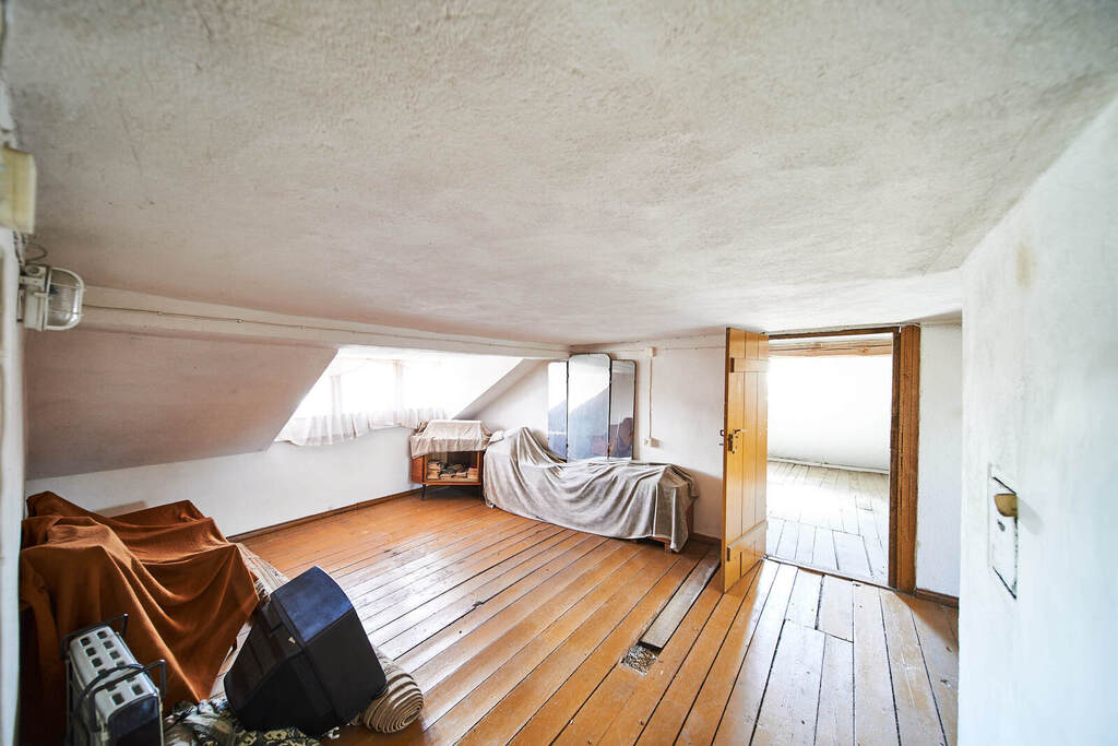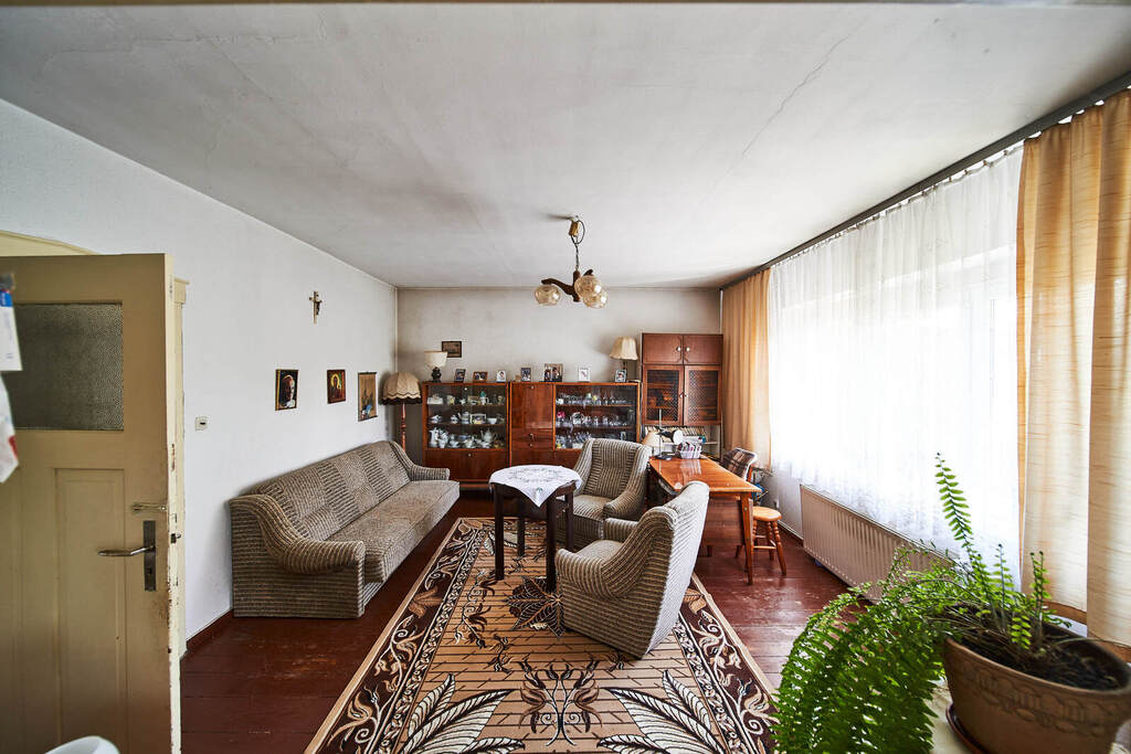 Parter domu stanowi salon ze starymi, przesuwnymi drzwiami, 3 pokoje, kuchnia ze spiżarką, łazienka z oknem i przedpokój.