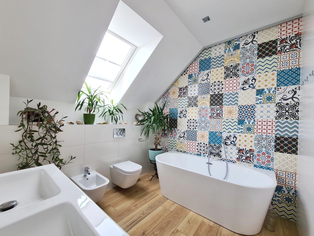 - na podłogach panele oraz kafle, ściany gładzone i malowane, w salonie tynk japoński;