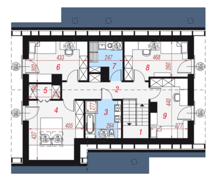 poddasze (pow. użytkowa 65,74 m2): pokój (10,20 m2), pokój (10,18 m2), pokój (9,99 m2), pokój (9,09 m2) z garderobą (2,34 m2), łazienka z wanną, umywalką, bidetem i toaletą (5,88 m2), pralnia (4,59 m2), hol (8,52 m2), schody (4,95 m2).