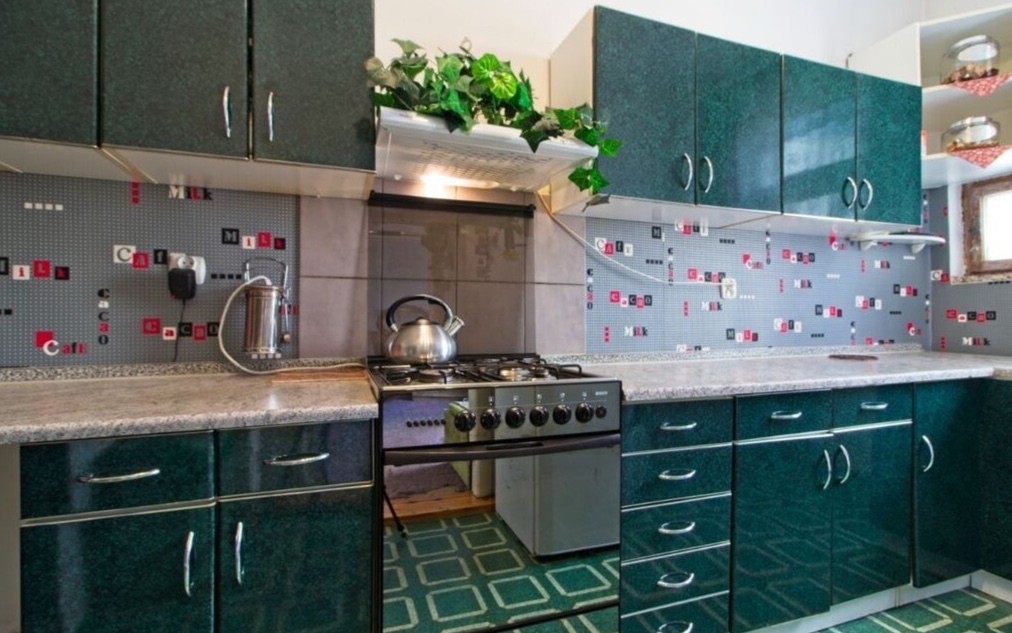 Kuchni z jadalnią- ustawna część kuchenna, wyposażona w meble i sprzęty AGD